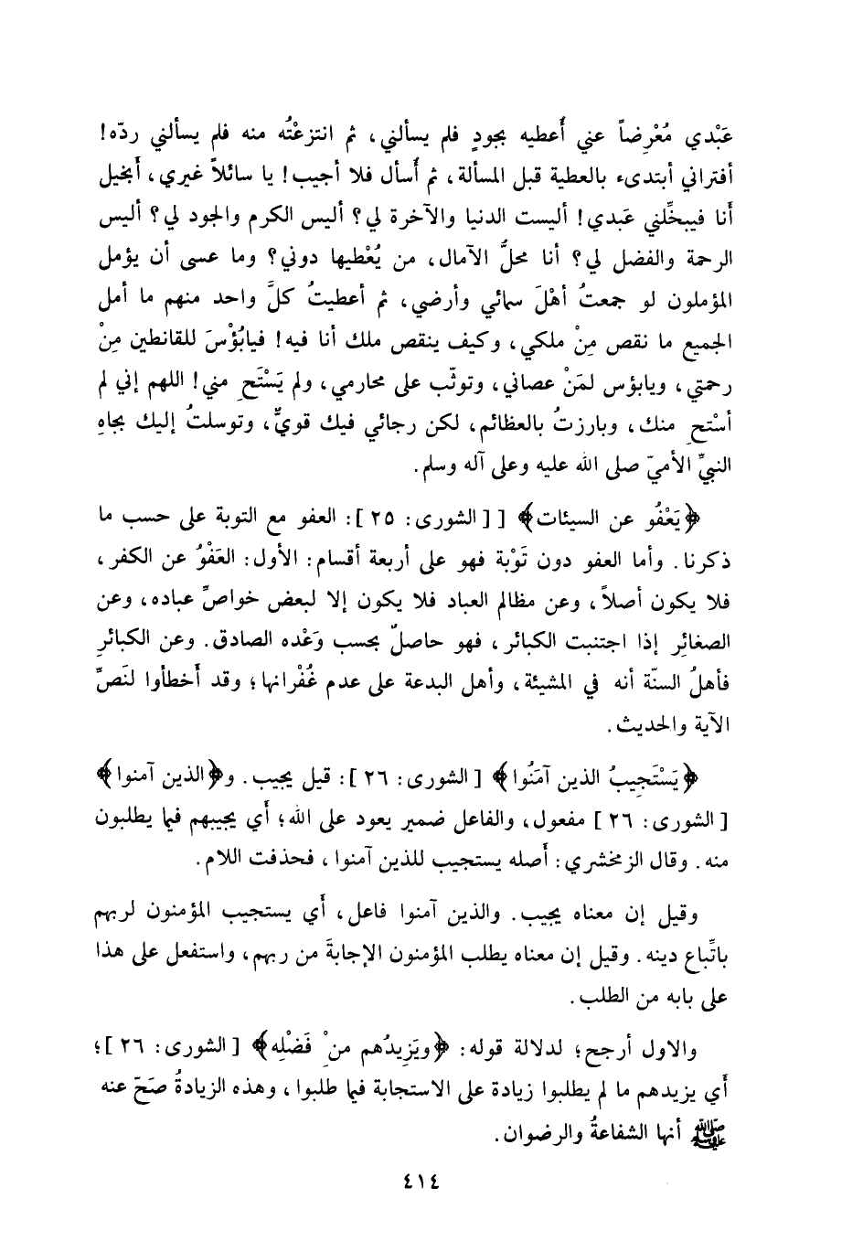 والأول أرجح، لدلالة قوله: (ويَزِيدهم من فَضْلِه) ، أي يزيدهم ما لم يطلبوا زيادة على الاستجابة فيما طلبوا، وهذه الزيادة صَحّ عنه - صلى الله عليه وسلم - أنها الشفاعةُ والرضوان.