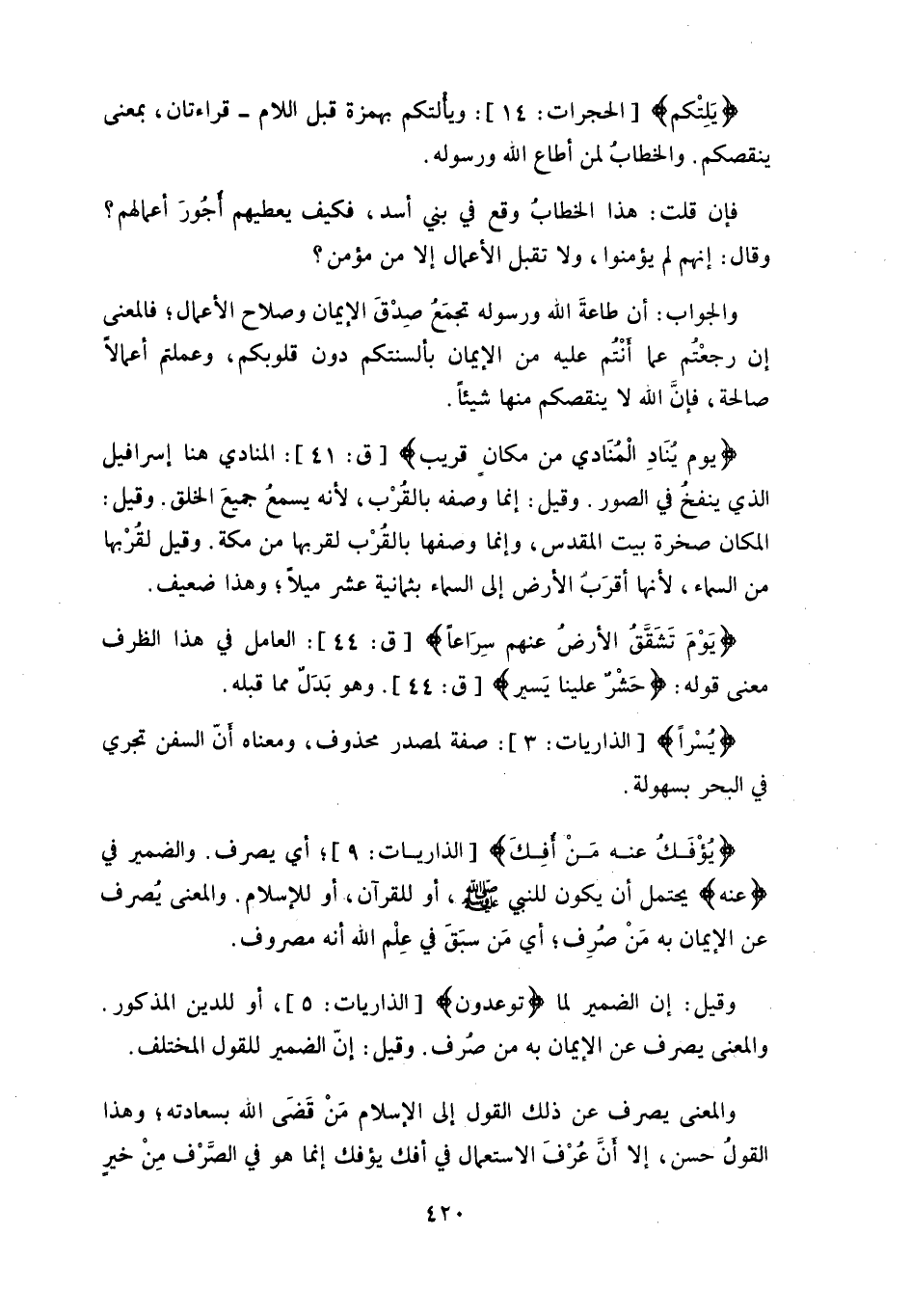 والجواب: أن طاعةَ الله ورسوله تجمَعُ صِدْقَ الإيمان وصلاح الأعمال، فالمعنى إن رجعْتم عما أنْتُم عليه من الإيمان بألسنتكم دون قلوبكم، وعملتم أعمالاً صالحة، فإنَّ الله لا ينقصكم منها شيئاً.