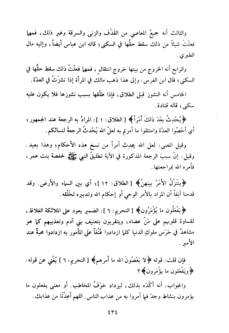 فعلت شيئاً من ذلك سقط حقُّها في السكنى، قاله ابن عباس أيضاً، وإليه مال