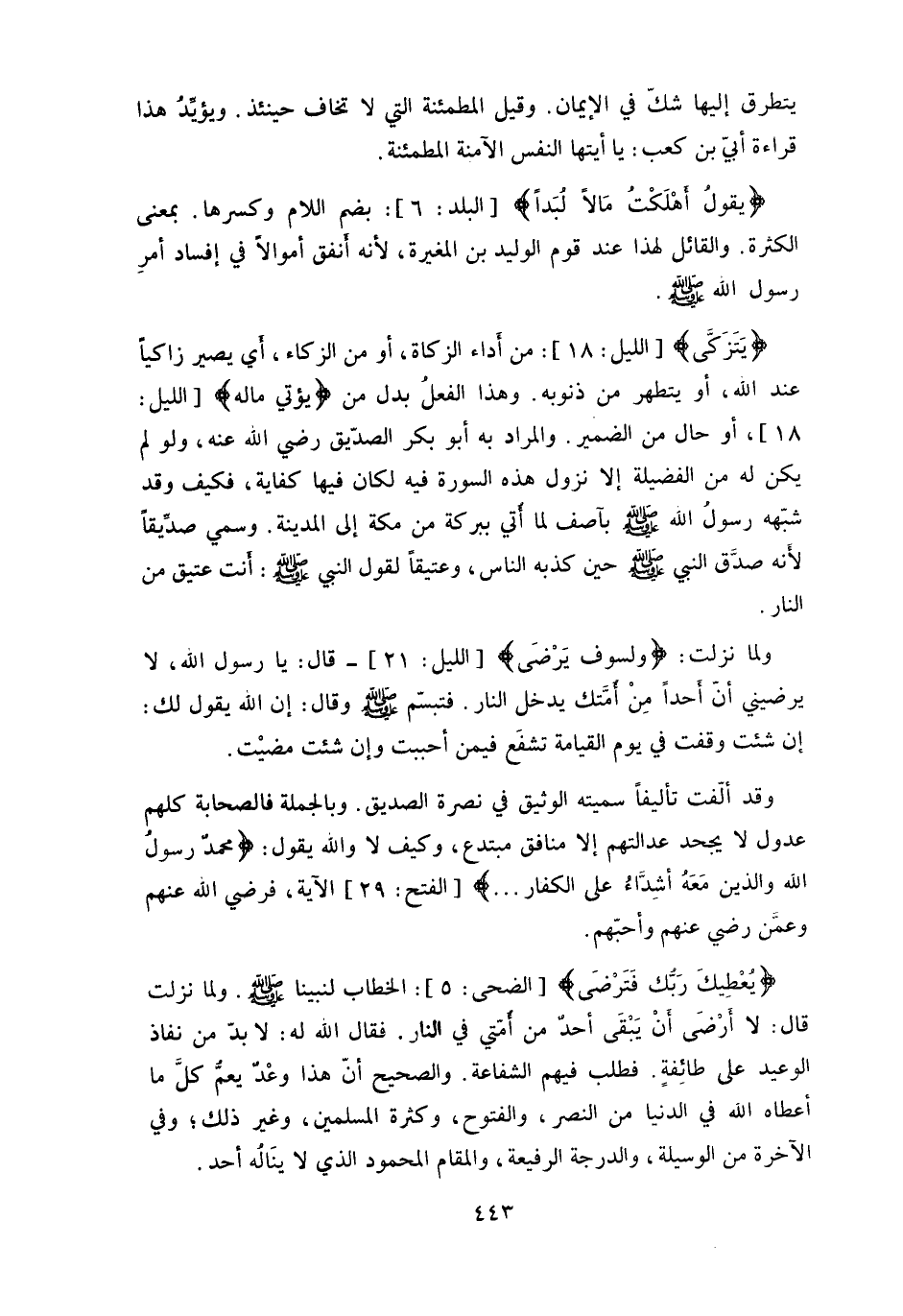 ولما نزلت: (ولسوف يَرْضَى) ، قال: يا رسول الله، لا يرضيني أنَ أحداً مِنْ أمَّتك يدخل النار.