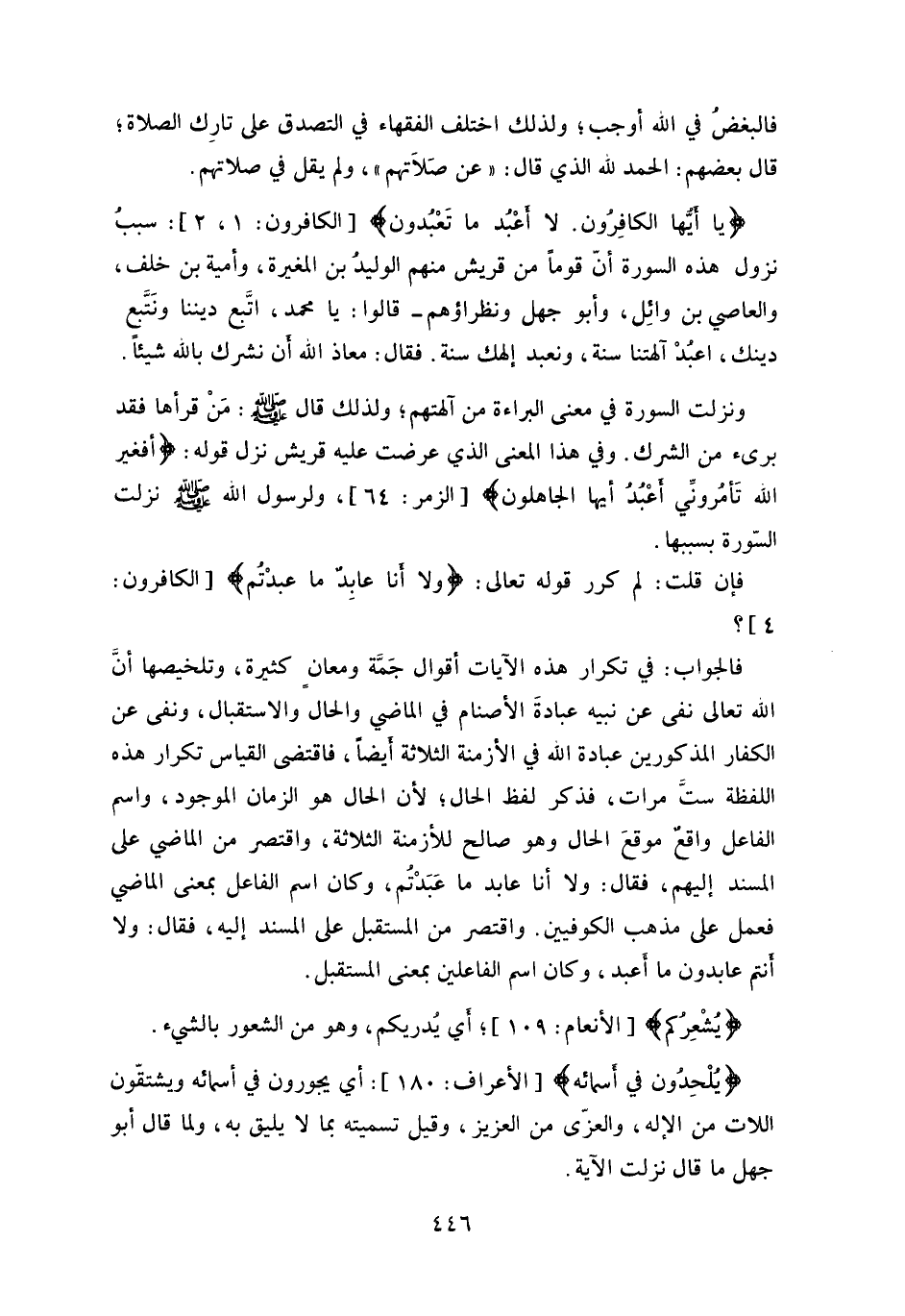 الكفار المذكورين عبادة الله في الأزمنة الثلاثة أيضاً، فاقتضى القياس تكرار هذه اللفظة ستَّ مرات، فذكر لفظ الحال، لأن الحال هو الزمان الموجود، واسم الفاعل واقعٌ موقعَ الحال وهو صالح للأزمنة الثلاثة، واقتصر من الماضي على المسند إليهم، فقال: (ولا أنا عابد ما عَبَدْتم) ، وكان اسم الفاعل بمعنى الماضي فعمل على مذهب الكوفيين.