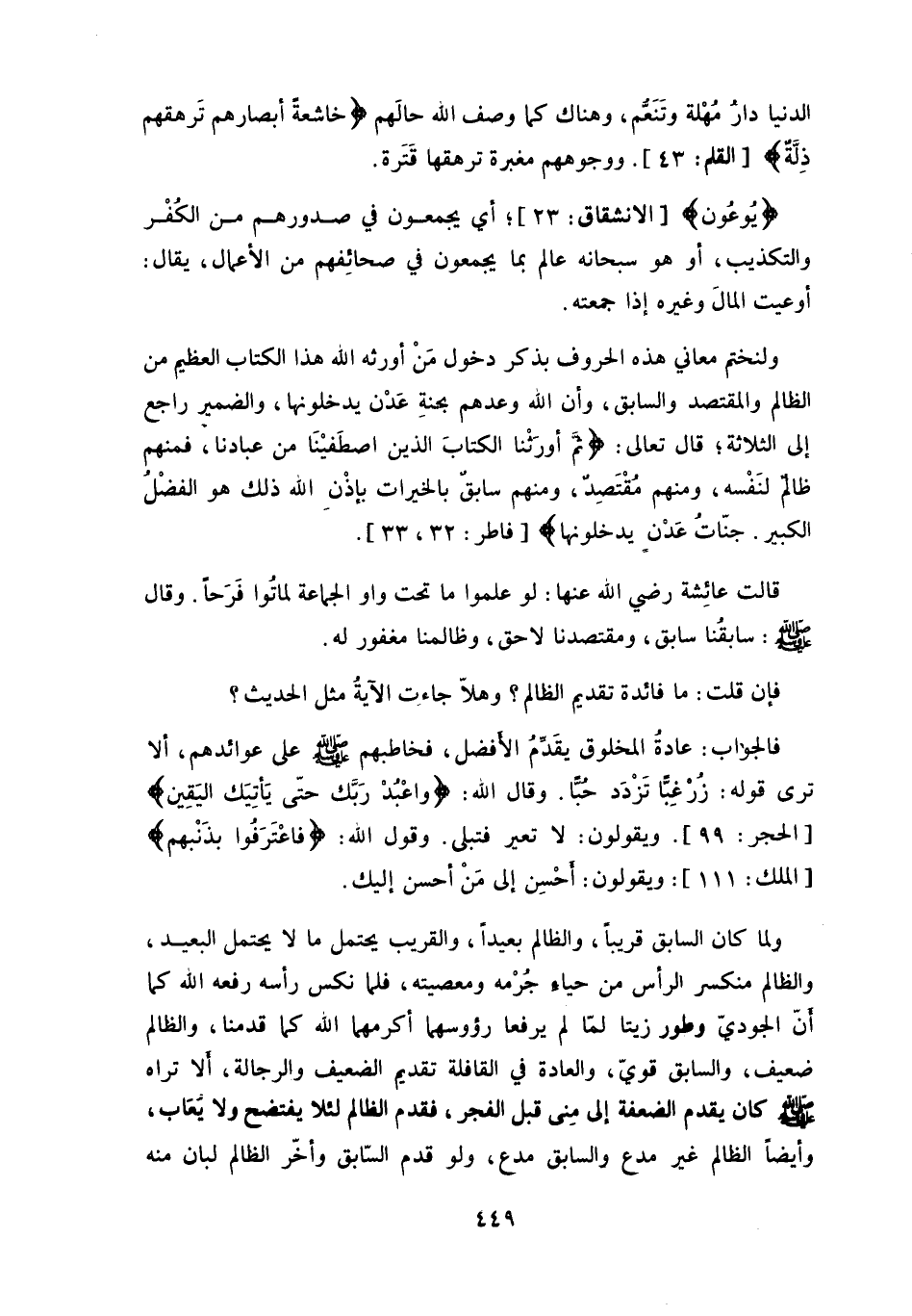 الظالم والمقتصد والسابق، وأن الله وعدهم بجنةِ عَدْن يدخلونها، والضمير راجع إلى الثلاثة، قال تعالى: (ثُمَّ أَوْرَثْنَا الْكِتَابَ الَّذِينَ اصْطَفَيْنَا مِنْ عِبَادِنَا فَمِنْهُمْ ظَالِمٌ لِنَفْسِهِ وَمِنْهُمْ مُقْتَصِدٌ وَمِنْهُمْ سَابِقٌ بِالْخَيْرَاتِ بِإِذْنِ اللَّهِ ذَلِكَ هُوَ الْفَضْلُ الْكَبِيرُ (32) جَنَّاتُ عَدْنٍ يَدْخُلُونَهَا يُحَلَّوْنَ) .