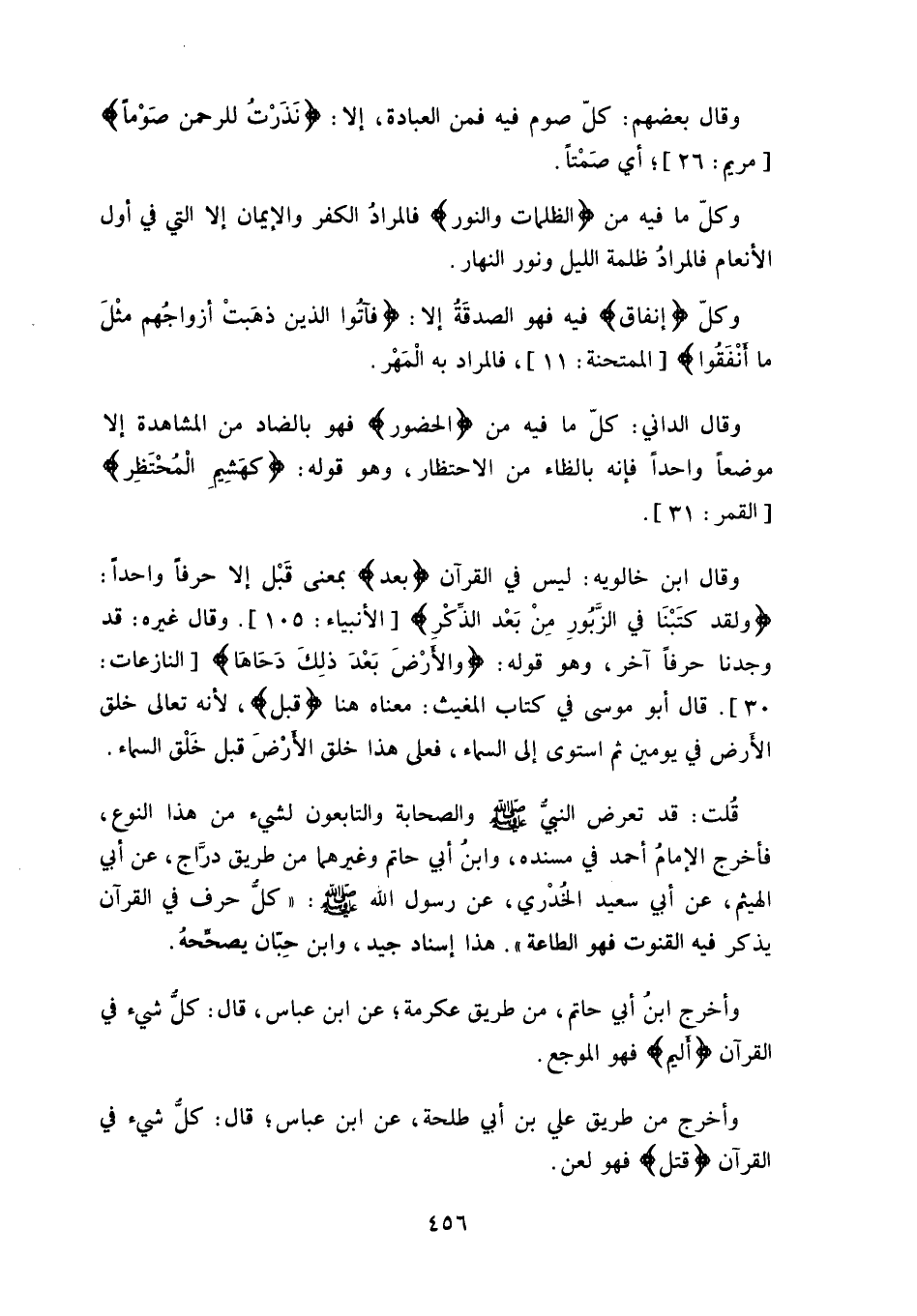 قُلت: قد تعرض النبي - صلى الله عليه وسلم - والصحابة والتابعون لشيء من هذا النوع، فأخرج الإمامُ أحمد في مسنده، وابنُ أبي حاتم وغيرهما من طريق درَّاج، عن أبي الهيثم، عن أبي سعيد الخُدْري، عن رسول الله - صلى الله عليه وسلم -: " كلّ حرف في القرآن يذكر فيه القنوت فهو الطاعة ".
