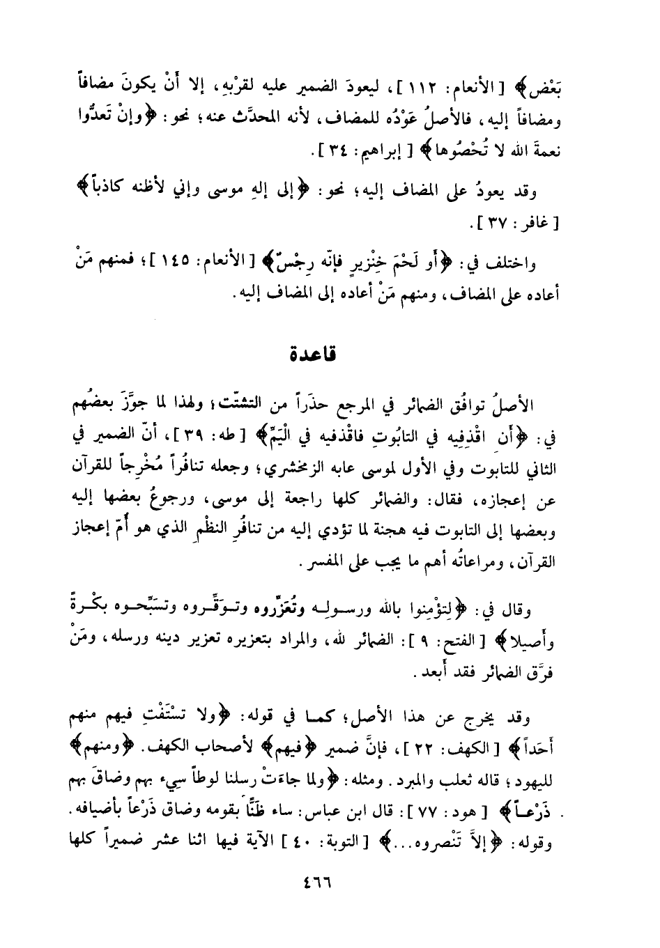 ليعودَ الضمير عليه لقرْبهِ، إلا أنْ يكونَ مضافاً ومضافاً إليه، فالأصلُ عَوْده للمضاف، لأنه المحدَّث عنه، نحو: (وإنْ تعدُّوا نعمتَ الله لا تحْصوها) .