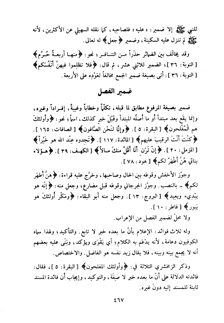 وذكر الزمخشري الثلاثة في: (وأولئك المفلحون) ، فقال: فائدته الدلالة على أنَّ ما بعده خبر لا صِفَة، والتوكيد، وإيجاب أن فائدة المسند ثابتة للمسند إليه دونَ غيره