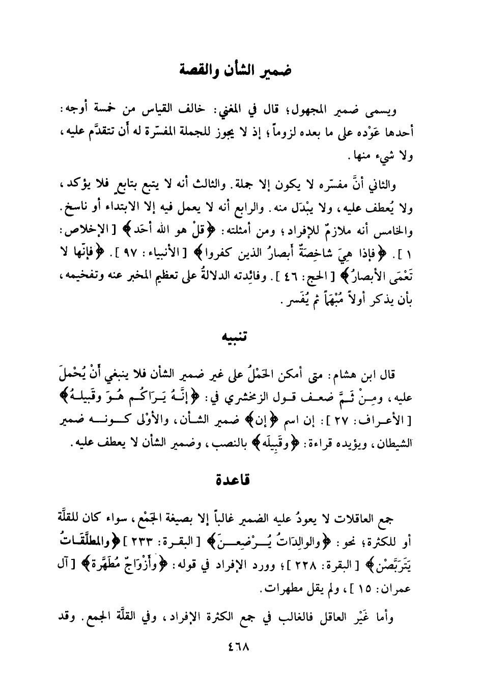 قال ابن هشام: متى أمكن الحَمْلُ على غير ضمير الشأن فلا ينبغي أن يُحْملَ