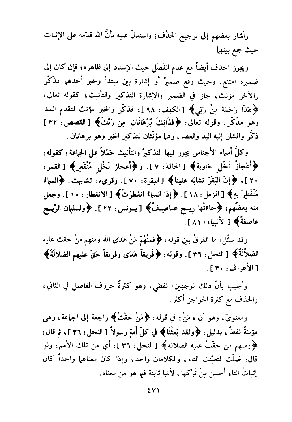 مؤنثةٌ لفظاً، بدليل: (وَلَقَدْ بَعَثْنَا فِي كُلِّ أُمَّةٍ رَسُولًا) ، ثم قال: (ومنهم من حقَّتْ عليه الضلالة) : أي من تلك الأمم، ولو قال: ضلّت لتعيَّنتِ التاء، والكلامان واحد، وإذا كان معناهما واحداً كان إثبات التاءِ أحسن مِنْ تَرْكها، لأنها ثابتة فيما هو من معناه.