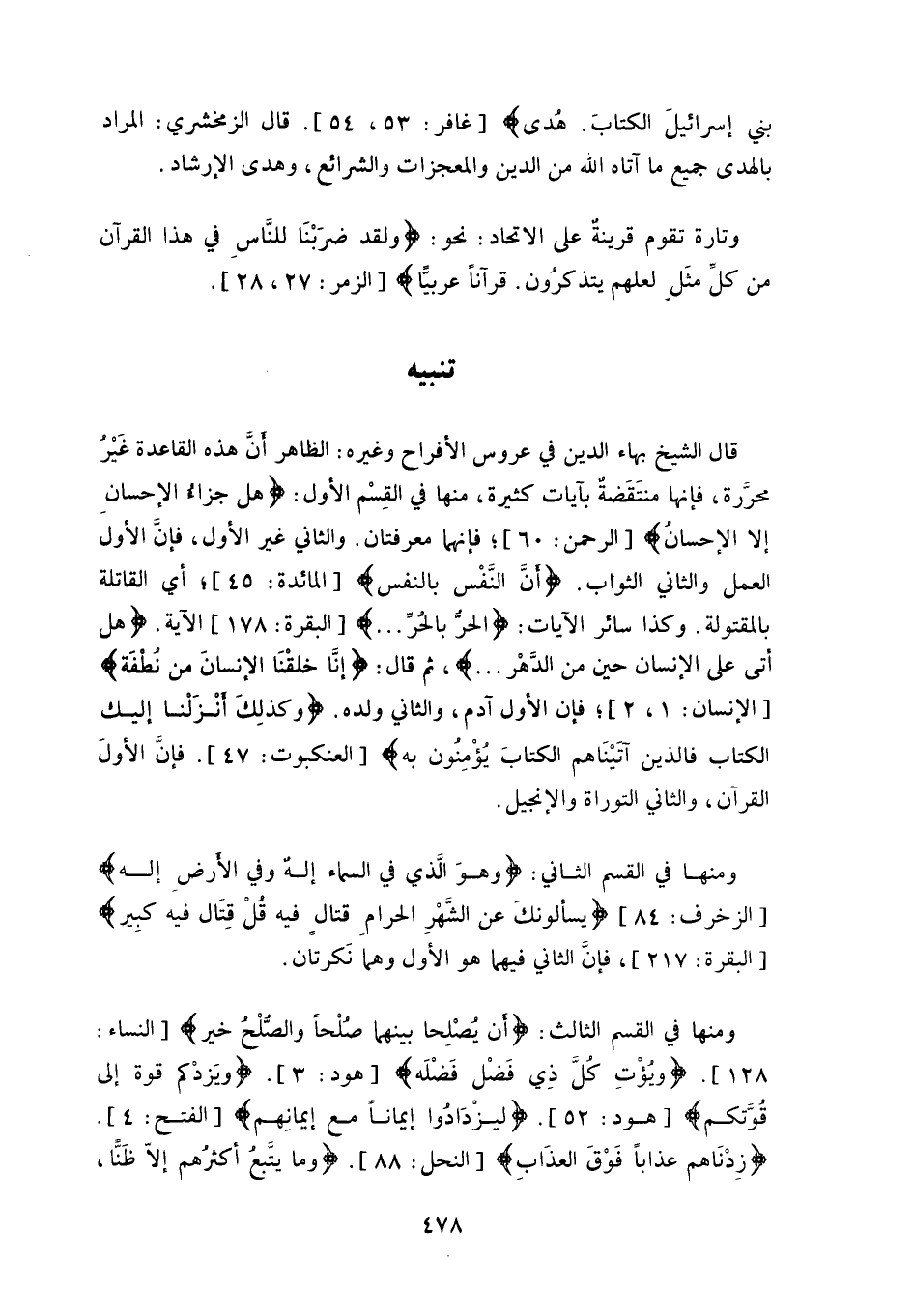 محرّرة، فإنها منتَقَضةٌ بآيات كثيرة، منها في القِسْم الأول: (هَلْ جَزَاءُ الْإِحْسَانِ إِلَّا الْإِحْسَانُ) ، فإنهما معرفتان.