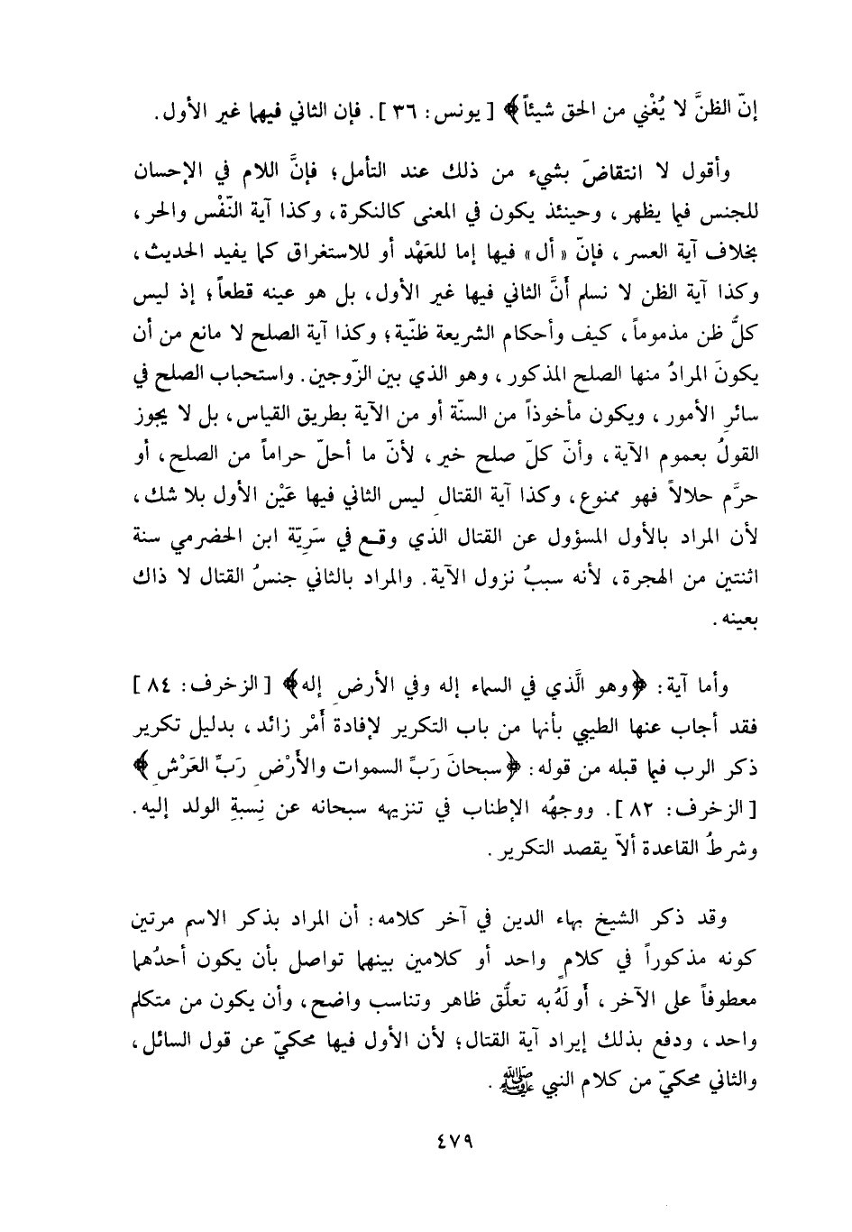 للجنس فيما يظهر، وحينئذ يكون في المعنى كالنكرة، وكذا آية النّفْس والحر، بخلاف آية العسر، فإنَّ " أل " فيها إما للعَهْد أو للاستغراق كما يفيد الحديث، وكذا آية الظن لا نسلم أنَّ الثاني فيها غير الأول، بل هو عينه قطعاً، إذ ليس كلّ ظن مذموماً، كيف وأحكام الشريعة ظنية، وكذا آية الصلح لا مانع من أن يكونَ المراد منها الصلح المذكور، وهو الذي بين الزوجين.