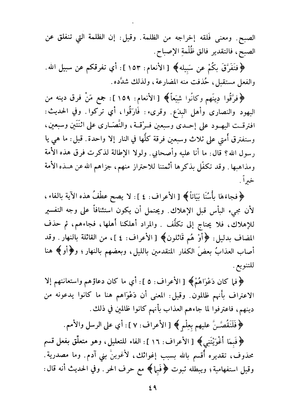 وقيل: إن الظلمة التي تنفلق عن الصبح، فالتقدير فالق ظلْمةِ الإصباح.
