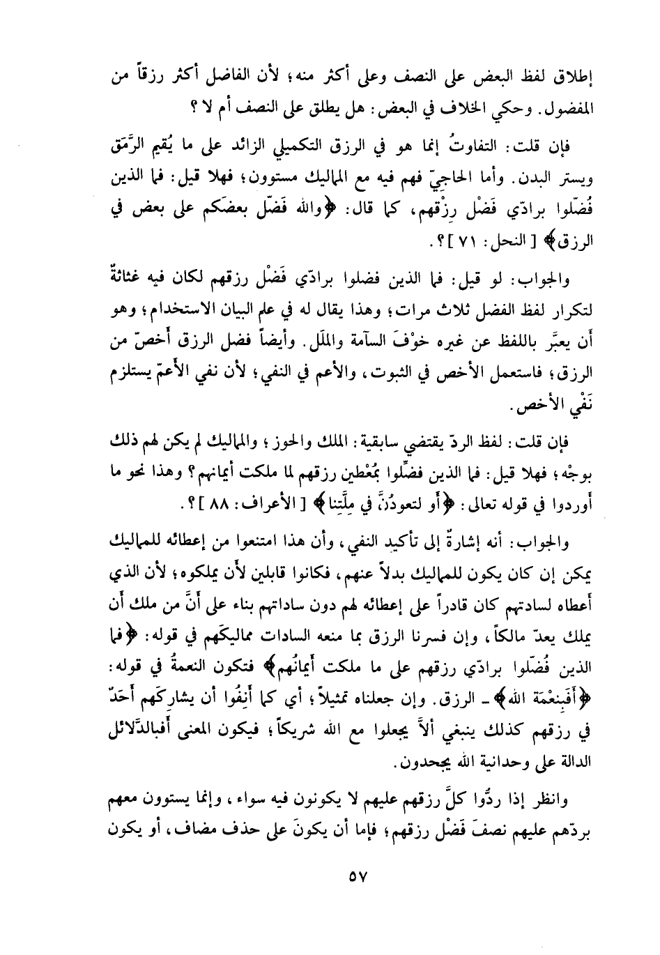 فإن قلت: لفظ الردّ يقتضي سابقية: الملك والحوز، والمماليك لم يكن لهم ذلك بوجْه، فهلا قيل: فما الذين فضِّلوا بمعْطين رزقهم لما ملكت أيمانهم، وهذا نحو ما أوردوا في قوله تعالى، (أو لتعودُنَّ في مِلَّتِنا) ؟