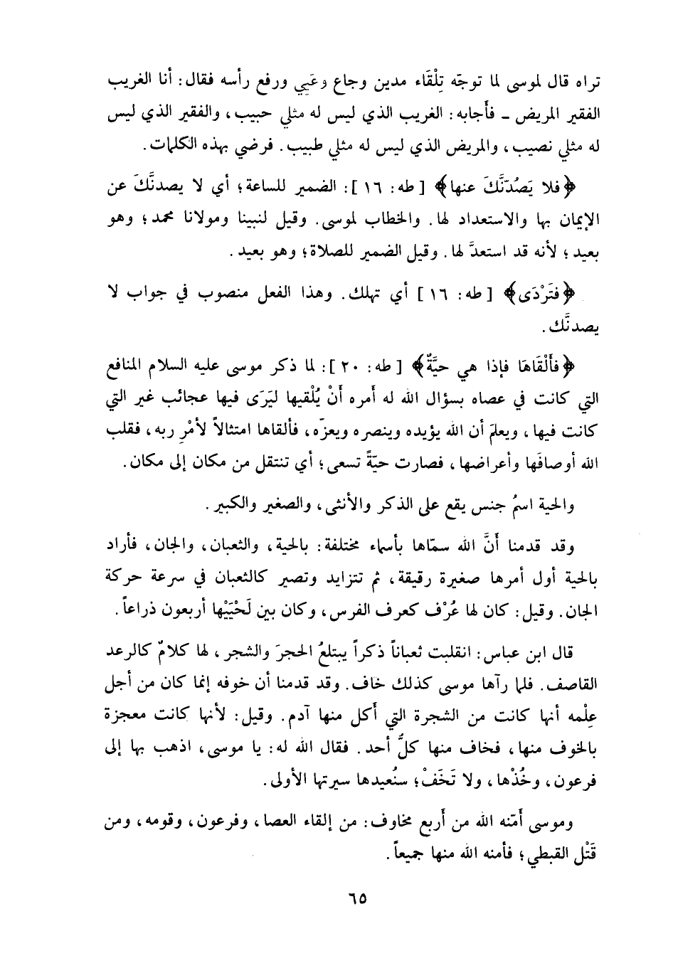 لما ذكر موسى عليه السلام المنافع التي كانت في عصاه بسؤال الله له أمره أنْ يُلْقيها ليَرَى فيها عجائب غير التي كانت فيها، ويعلمَ أن الله يؤيده وينصره ويعزّه، فألقاها امتثالاً لأمْرِ ربه، فقلب الله أوصافَها وأعراضها، فصارت حيّةً تسعى، أي تنتقل من مكان إلى مكان.