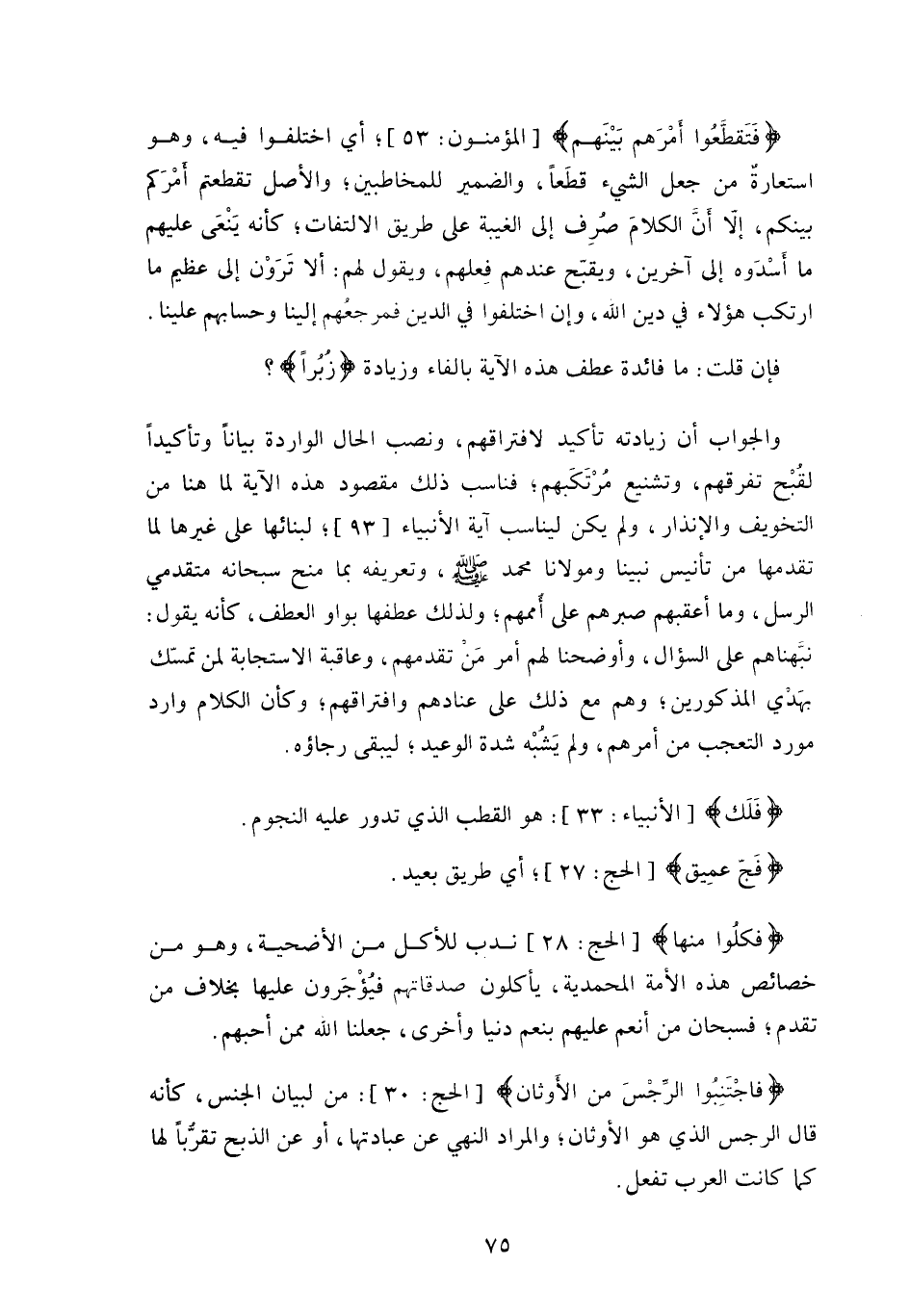 أي اختلفوا فيه، وهو استعارةٌ من جعل الشيء قطَعاً، والضمير للمخاطبين، والأصل تقطعتم أمْرَكم بينكم، إلا أَن الكلامَ صرِف إلى الغيبة على طريق الالتفات، كأنه يَنْعَى عليهم ما أَسدَوه إلى آخرين، ويقتح عندهم فِعلهم، ويقول هم: ألا تَرَوْن إلى عظيم ما ارتكب هؤلاء في دين الله، وإن اختلفوا في الدين مرجعُهم إلينا وحسابهم علينا.