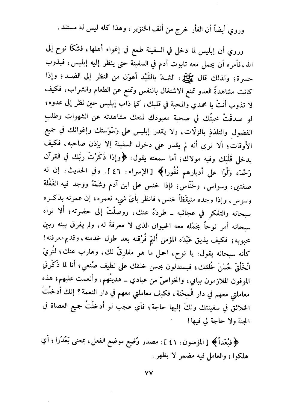 اللَه، فأمره أن يحمل معه تابوت آدم في السفينة حتى ينظر إليه إبليس، فيذوب حسرة، ولذلك قال - صلى الله عليه وسلم -: الشدّ بالقَيْد أهوَن من النظر إلى الضد، وإذا كانت مشاهدة العدو تمنع الاشتغال بالنفس وتمنع عن الطعام والشراب، فكيف لا تذوب أنْتَ يا محمدي والمحبة في قلبك، كما ذاب إبليس حين نظر إلى عدوه.
