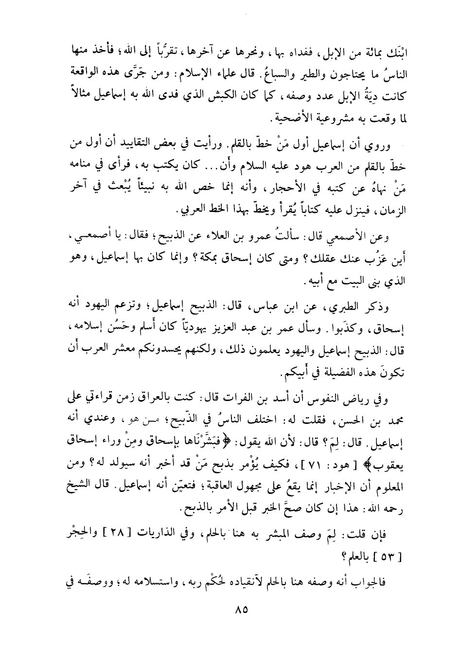 قال: الذبيح إسماعيل واليهود يعلمون ذلك، ولكنهم يحسدونكم معشر العرب أن تكونَ هذه الفضيلة في أبيكم.