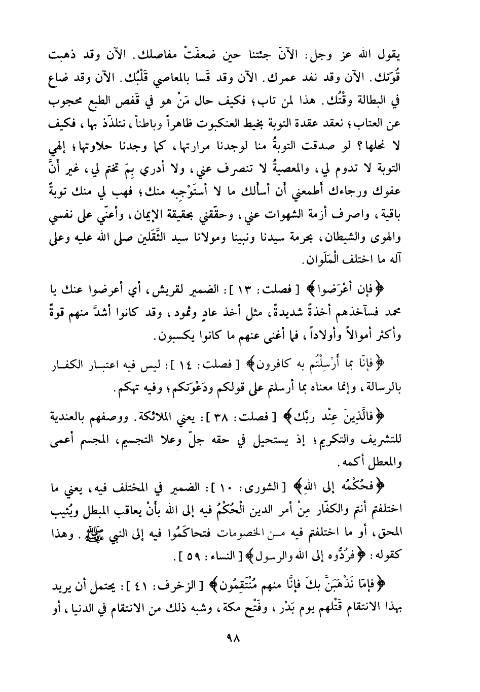 عن العتاب، نعقد عقدة التوبة بخيط العنكبوت ظاهراً وباطناً، نتلذّذ بها، فكيف لا نحلها، لو صدقت التوبة منا لوجدنا مرارتها، كما وجدنا حلاوتها، إلهي التوبة لا تدوم لي، والمعصية لا تنصرف عني، ولا أدري بِمَ تختم لي، غير أنَّ عفوك ورجاءك أطمعني أن أسألك ما لا أستَوْجِبه منك، فهب لي منك توبةً باقية، واصرف أزمة الشهوات عني، وحقّقني بحقيقة الإيمان، وأعنّي على نفسي والهوى والشيطان، بحرمة سيدنا ونبينا ومولانا سيد الثَّقَلين صلى الله عليه وعلى آله ما اختلف الْمَلَوان.