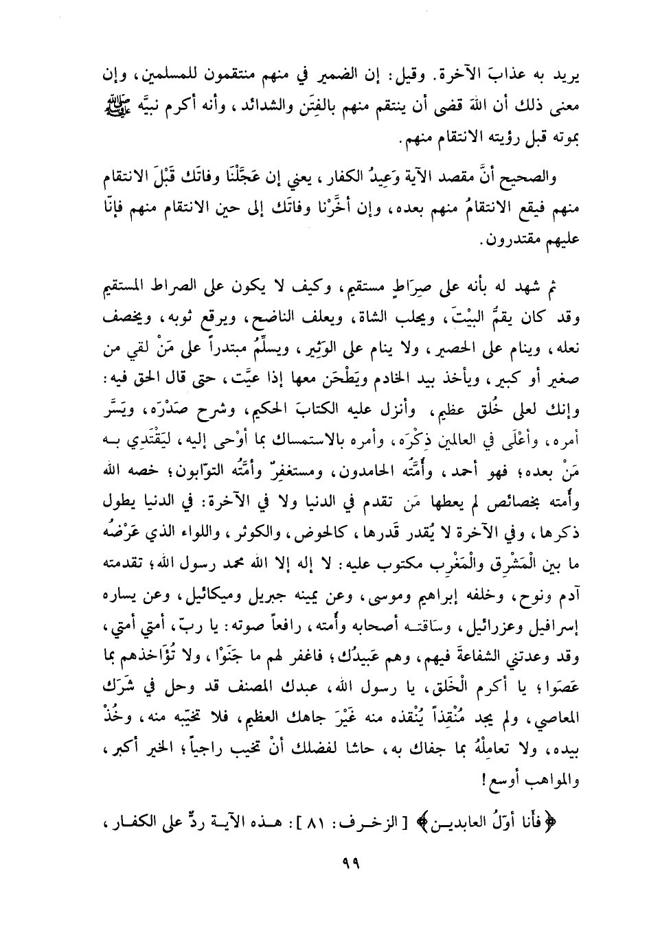وقد كان يقمُّ البيْتَ، ويحلب الشاة، ويعلف الناضح، ويرقع ثوبه، ويخصف نعله، وينام على الحصير، ولا ينام على الوَثِير، ويسلِّمُ مبتدراً على مَنْ لقي من صغير أو كبير، ويأخذ بيد الخادم ويَطْحَن معها إذا عيَّت، حتى قال الحق فيه: (وَإِنَّكَ لَعَلَى خُلُقٍ عَظِيمٍ) ، وأنزل عليه الكتابَ الحكيم، وشرح صَدْرَه، ويَسَّر أمره، وأعْلَى في العالمين ذِكْرَه، وأمره بالاستمساك بما أوْحى إليه، ليَقتَدِي به مَنْ بعده، فهو أحمد، وأمَّته الحامدون، ومستغفِرٌ وأمَّتُه التوَّابون، خصه الله وأمته بخصائص لم يعطها مَن تقدم في الدنيا ولا في الآخرة: في الدنيا يطول ذكرها، وفي الآخرة لا يُقدر قَدرها، كالحوض، والكوثر، واللواء الذي عَرْضُه ما بين الْمَشْرِق والْمَغْرِب مكتوب عليه: