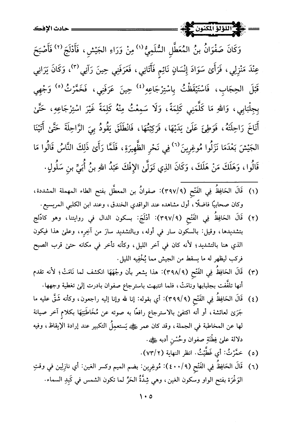 (¬2) قَالَ الحَافِظُ فِي الفَتْحِ (9/ 393): أي أن قصَّتَها وقعَتْ حالَ رُجوعهم من الغزوة قُرب دخولهم المدينة.