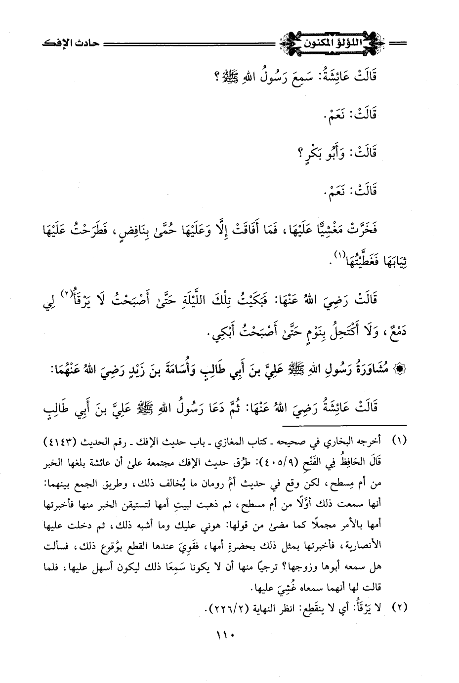 (¬1) قَالَ الحَافِظُ فِي الفَتْحِ (9/ 404): وعند الطبراني بإسناد صحيح قالت عائشة: لما بلغني ما تكلموا به همَمْتُ أن آتي قَلِيبًا فأطرَحَ نَفْسِي فيه.