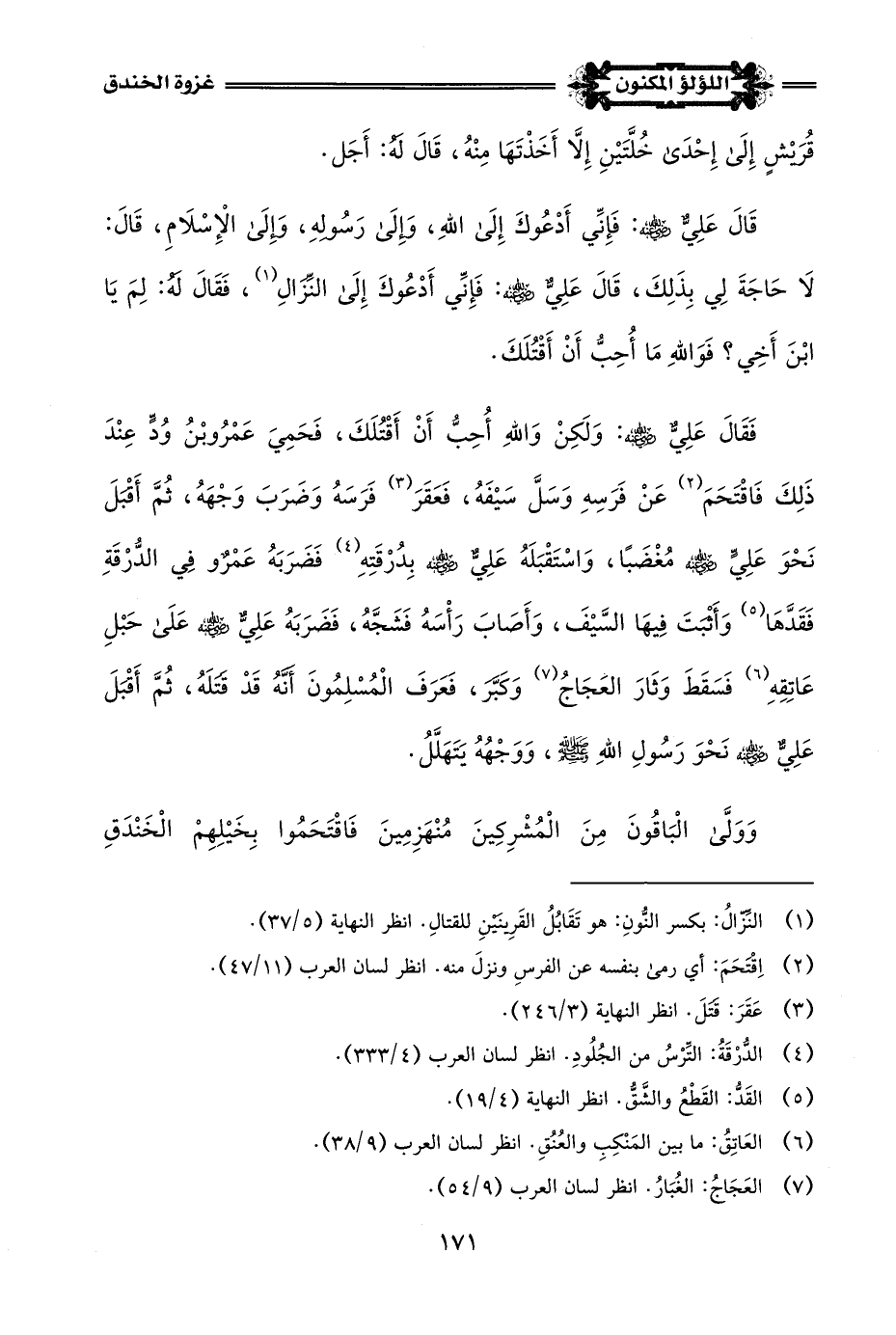 لَا يَزَالُ الرَّسُولُ -صلى اللَّه عليه وسلم- وَالْمُسْلِمُونَ عَلَى الْخَنْدَقِ، وَعَدُوُّهُمْ يُحَاصِرُهُمْ وَلَمْ يَكُنْ بَيْنَهُمْ قِتَالٌ إِلَّا الرَّمْيُ بِالنِّبَالِ، حَتَّى خَرَجَتْ فَوَارِسٌ مِنْ قُرَيْشٍ عَلَى خَيْلهِمْ بَعْدَ أَنْ تَلَبَّسُوا لِلْقِتَالِ، مِنْهُمْ عَمْرُو بْنُ وُدٍّ، وَعِكْرَمَةُ بْنُ أَبِي جَهْلٍ، وَهُبَيْرَةُ بْنُ أَبِي وَهْبٍ، وَنَوْفَلُ بْنُ عَبْدِ اللَّهِ، وَضِرَارُ بْنُ الْخَطَّابِ، ثُمَّ أَقْبَلُوا تَعْنِقُ (¬2) بِهِمْ خَيْلُهُمْ، حَتَّى وَقَفُوا عَلَى الْخَنْدَقِ، ثُمَّ تيَمَّمُوا (¬3) مَكَانًا ضَيِّقًا فَاقْتَحَمُوا مِنْهُ، وَجَالَتْ (¬4) بِهِمْ خَيْلُهُمْ فِي أَرْضٍ سَبْخَةٍ (¬5) بَيْنَ الْخَنْدَقِ وَسَلْعٍ (¬6)، فَأَسْرَعَ إِلَيْهِمْ عَلِيُّ بْنُ أَبِي طَالِبٍ -رضي اللَّه عنه- فِي نَفَرٍ مِنَ الْمُسْلِمِينَ حَتَّى أَخَذُوا عَلَيْهِمْ الثَّغْرَةَ التِي اقْتَحَمُوا مِنْهَا خَيْلَهُمْ.