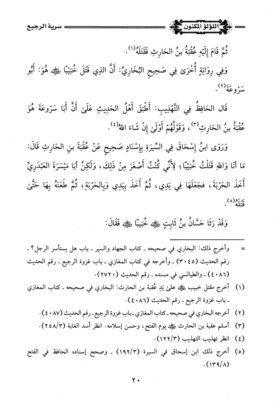وَأَمَّا خُبَيْبُ بنُ عَدِيٍّ -رضي اللَّه عنه- فَاشْتراهُ بَنُو الحَارِثِ بنِ عَامِرِ بنِ نَوْفَلٍ، وَكَانَ خُبَيْبٌ هُوَ الذِي قَتَلَ الحَارِثَ بنَ عَامِرٍ يَوْمَ بَدْرٍ، فَلَبِثَ خُبَيْبٌ عِنْدَهُمْ أَسِيرًا.