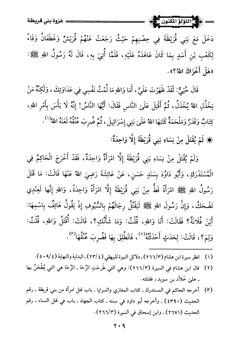 وأخرج ذلك البخاري في صحيحه - كتاب المغازي - باب مرجع النبي -صلى اللَّه عليه وسلم- من الأحزاب - رقم الحديث (4122) - مسلم في صحيحه - كتاب الجهاد والسير - باب جواز قتال من نقض العهد - رقم الحديث (1768) - والإمام أحمد في مسنده - رقم الحديث (25097) - وابن حبان في صحيحه - كتاب إخباره -صلى اللَّه عليه وسلم- عن مناقب الصحابة - باب ذكر سعد بن معاذ -رضي اللَّه عنه- رقم الحديث (7028) - والنسائي في السنن الكبرى - كتاب المناقب - باب سعد بن معاذ -رضي اللَّه عنه- رقم الحديث (8166) - وابن إسحاق في السيرة (3/ 264) - وابن سعد في طبقاته (2/ 287).