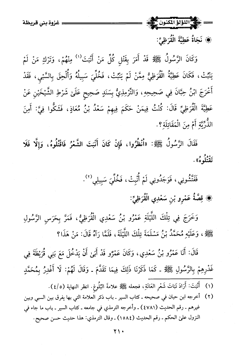 (¬2) أخرج ذلك الإمام أحمد في مسنده - رقم الحديث (25097) - وابن حبان في صحيحه - كتاب إخباره -صلى اللَّه عليه وسلم- عن مناقب الصحابة - باب ذكر سعد بن معاذ -رضي اللَّه عنه- رقم الحديث (7028) (4784) - وأخرجه الترمذي في جامعه - كتاب السير - باب ما جاء في النزول على الحكم - رقم الحديث (1673) - وقال الترمذي: هذا حديث حسن صحيح.