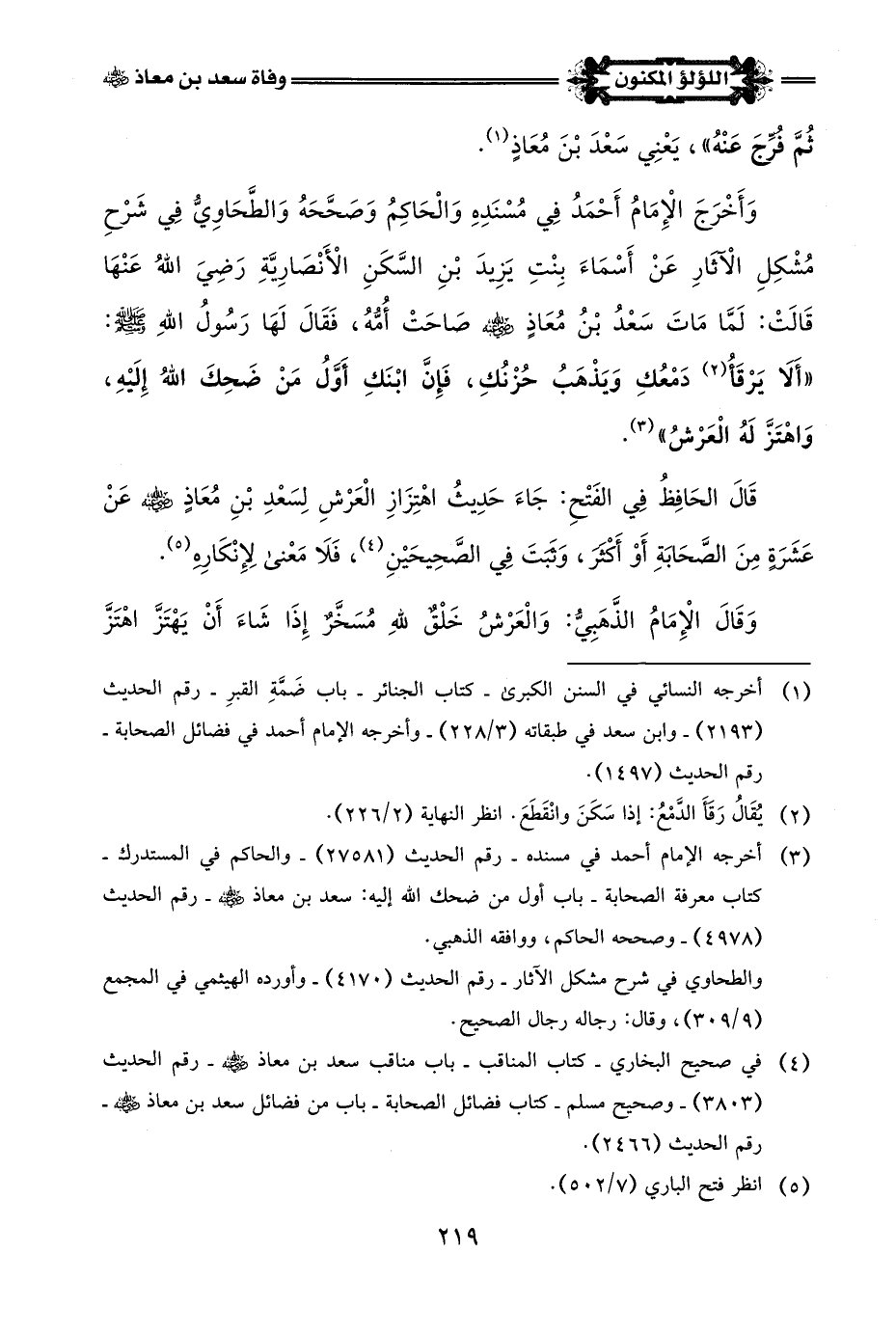 * اهْتِزَازُ الْعَرْشِ لِمَوْتِ سَعْدِ بْنِ مُعَاذٍ -رضي اللَّه عنه-: