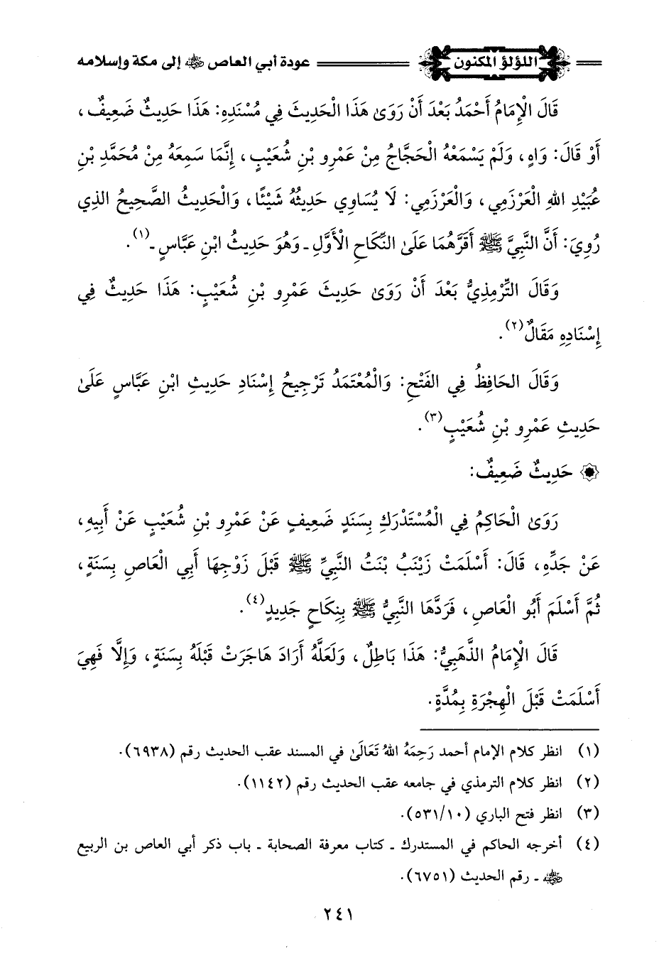 وَأَمَّا حَدِيثُ عَمْرِو بْنِ شُعَيْبٍ، عَنْ أَبِيهِ، عَنْ جَدِّهِ: أَنَّ رَسُولَ اللَّهِ -صلى اللَّه عليه وسلم- رَدَّ ابْنَتَهُ إِلَى أَبِي الْعَاصِ بِمَهْرٍ جَدِيدٍ، وَنِكَاحٍ جَدِيدٍ.