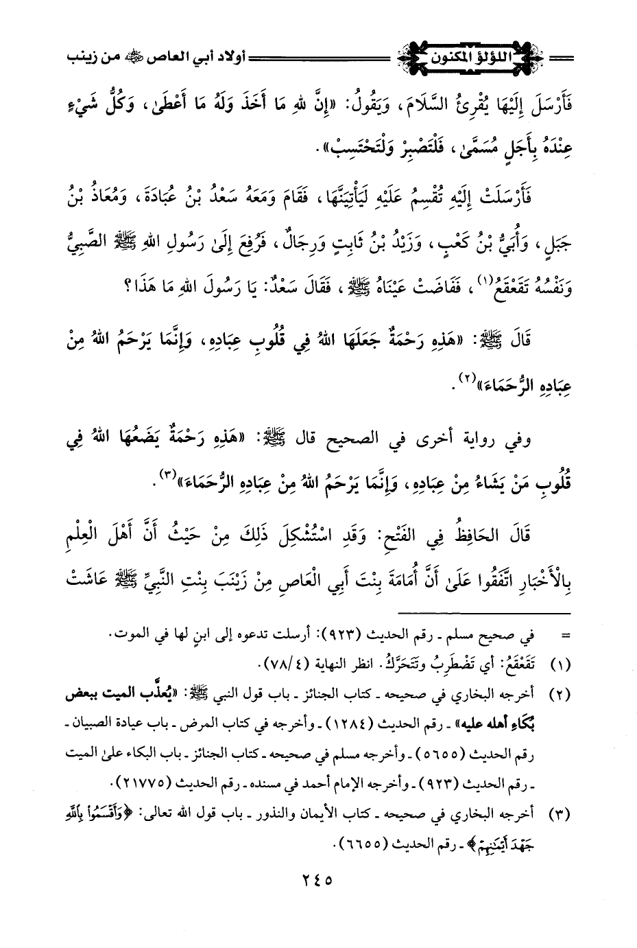 (¬4) قال الحافظ في الفتح (3/ 502): قيل هو عليّ بن أبي العاص بن الربيع، وهو من زينب كذا كتب الدمياطي بخطه في الحاشية، وفيه نظر لأنه لم يقع في شيء من طرق هذا الحديث. . . والصواب في حديث الباب أن المرسلة زينب، وأن الولدَ صَبية كما ثبت في مسند الإمام أحمد بسند صحيح - رقم الحديث (21799): قال أسامة بن زيد رَضِيَ اللَّهُ عَنْهُمَا: أُتي رسول -صلى اللَّه عليه وسلم- بأمَيْمَةَ بنت زينب ونفسها تَقَعْقَعُ كأنها في شَنٍّ -أي قربة-.