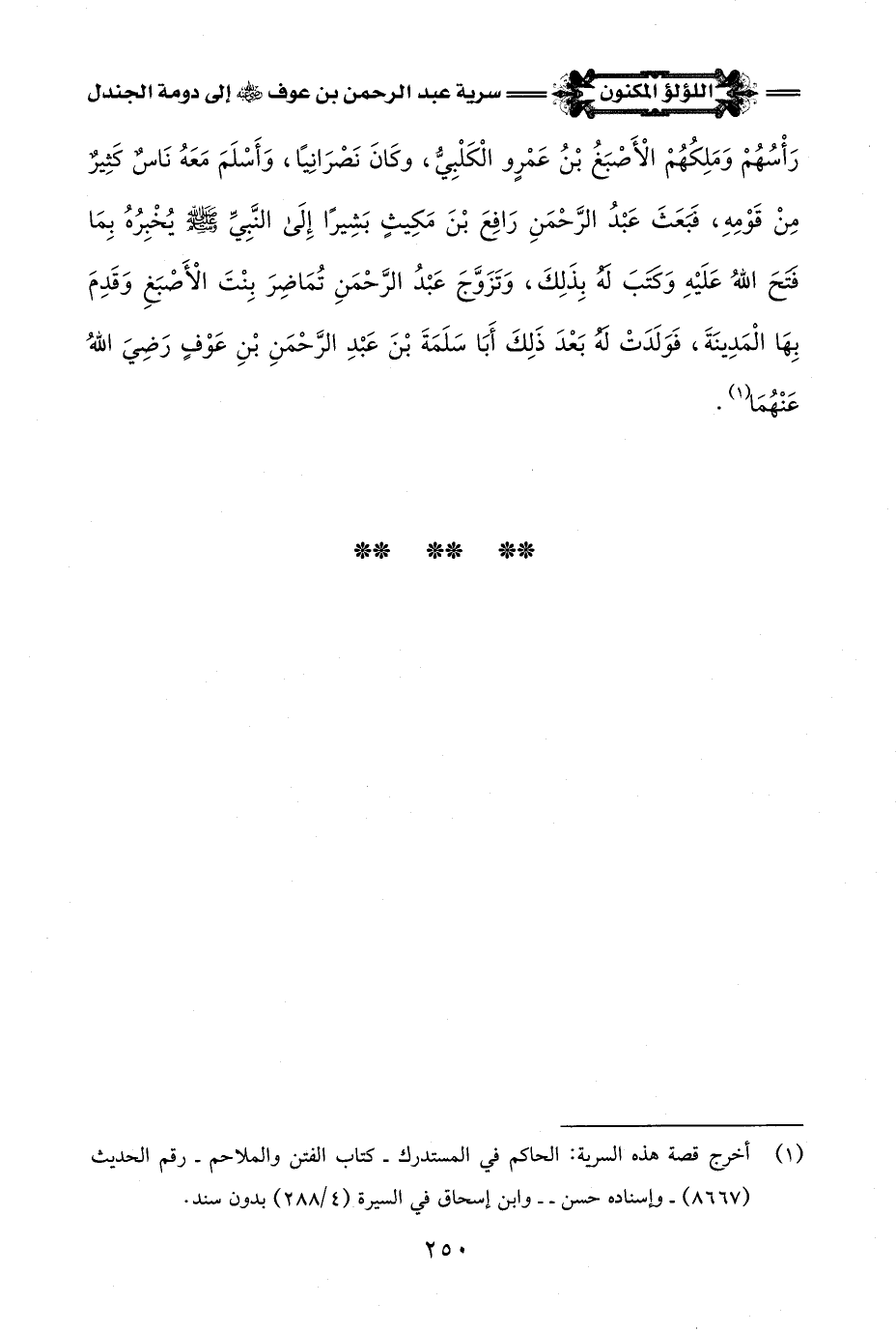 (¬3) أصلُ وصيَّة النبي -صلى اللَّه عليه وسلم- هذه لعبد الرحمن بن عوف -رضي اللَّه عنه-: في صحيح مسلم - كتاب الجهاد والسير - باب تأمير الإمام الأمراء على البعوث - رقم الحديث (1731).