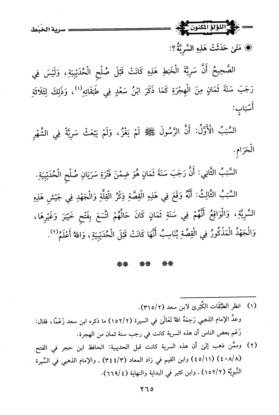 (¬7) أخرج قصة هذه السرية: البخاري في صحيحه - كتاب المغازي - باب غزوة سيف البحر- رقم الحديث (4360) (4361) (4362) - ومسلم في صحيحه - كتاب الصيد والذبائح - باب إباحة ميتات البحر - رقم الحديث (1935) - والإمام أحمد في مسنده - رقم الحديث (14336) (14337) (14338) - وأورده ابن الأثير في جامع الأصول - رقم الحديث (5007).