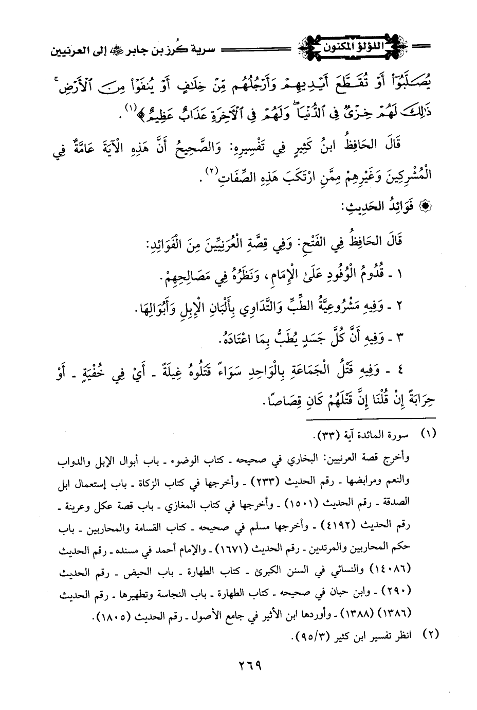 وَأَنْزَلَ اللَّهُ تَعَالَى عَلَى رَسُولِ اللَّهِ -صلى اللَّه عليه وسلم- فِي هَؤُلَاءِ الْعُرَنِيِّينَ قَوْلَه تَعَالَى: {إِنَّمَا جَزَاءُ الَّذِينَ يُحَارِبُونَ اللَّهَ وَرَسُولَهُ وَيَسْعَوْنَ فِي الْأَرْضِ فَسَادًا أَنْ يُقَتَّلُوا أَوْ