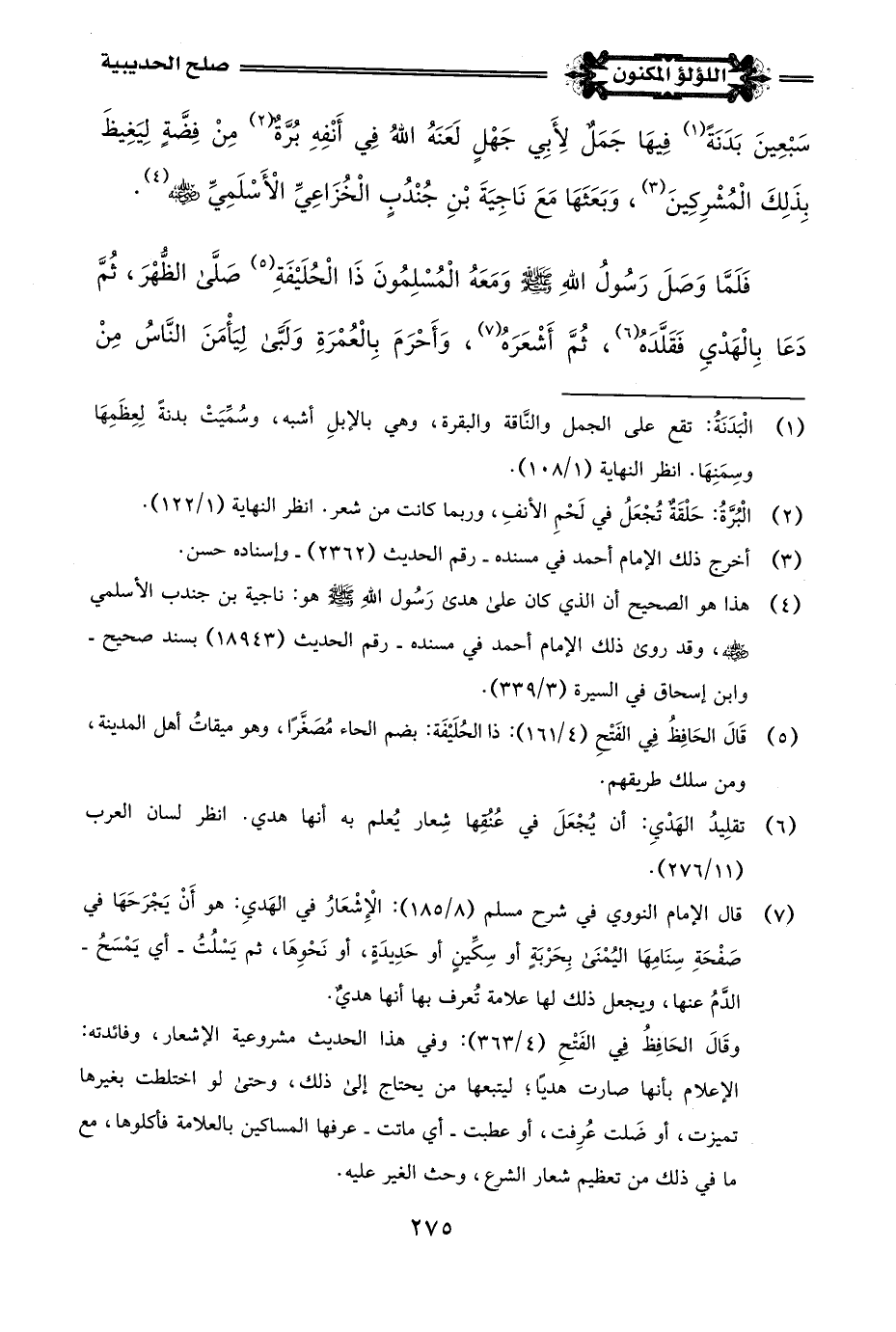 (¬5) الْهَدْيُ: هو ما يُهَدَى إلى البيتِ الحرام من النَّعَمِ لِتُنْحَرَ. انظر النهاية (5/ 220).