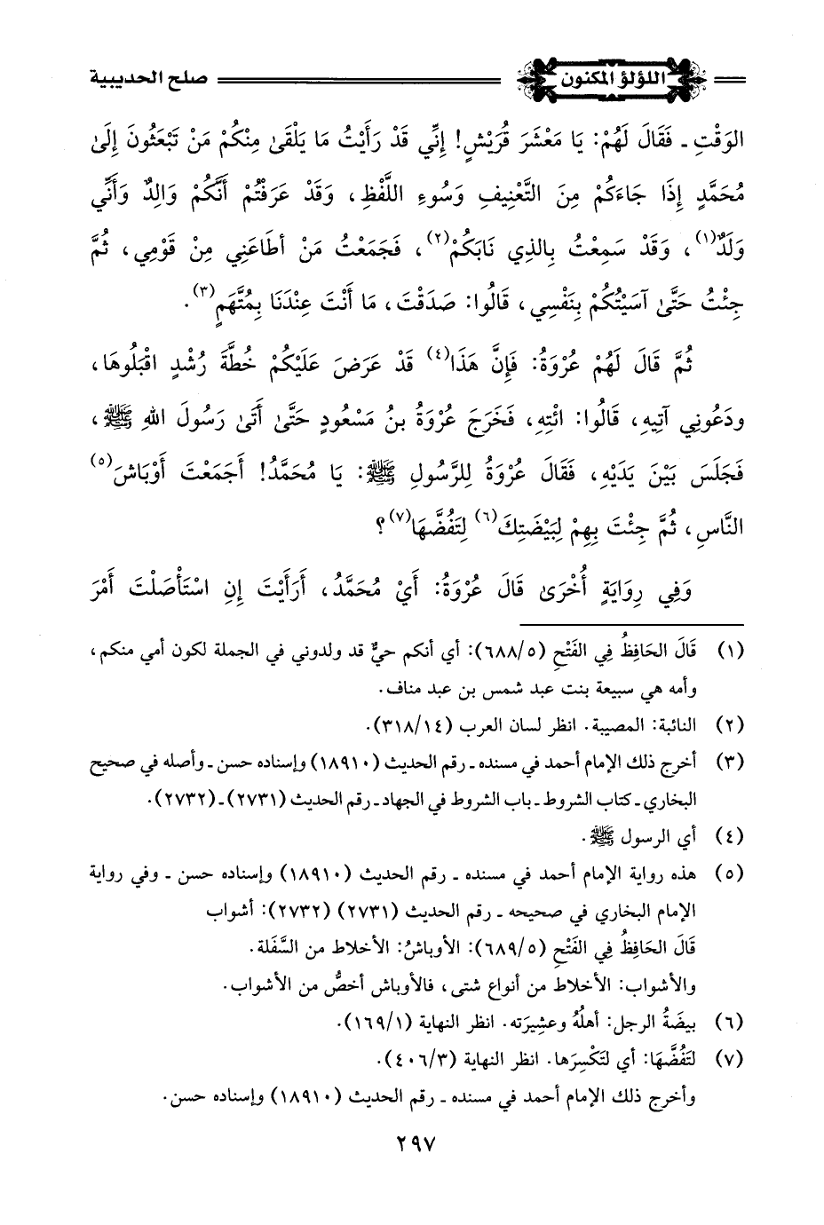 وفي رواية أخرى في مسند الإمام أحمد - رقم الحديث (18910) قال: يا معشر قريش! قد رأيت ما لا يحل صده، الهدي في قلائده قد أُكل أوباره من طول الحبس عن مَحِلِّه.