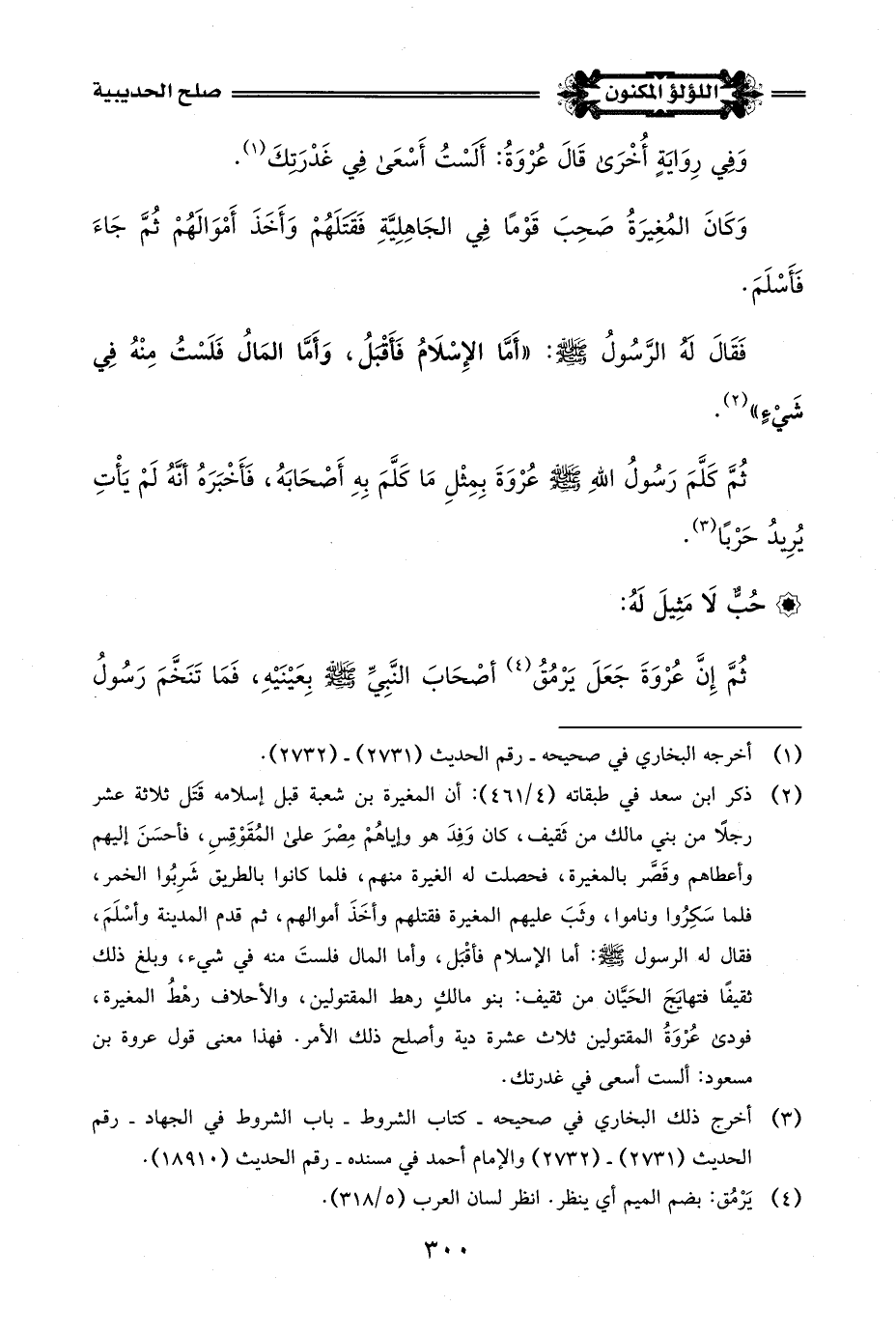 فَقَالَ عُرْوَةُ لِلْمُغِيرَةِ: وَيْحَكَ، مَا أَفَظَّكَ وَأَغْلَظَكً! فتَبَسَّمَ رَسُولُ اللَّهِ -صلى اللَّه عليه وسلم-، فَقَاَل لَهُ عُرْوَةُ: مَنْ هَذَا يَا مُحَمَّدُ؟
