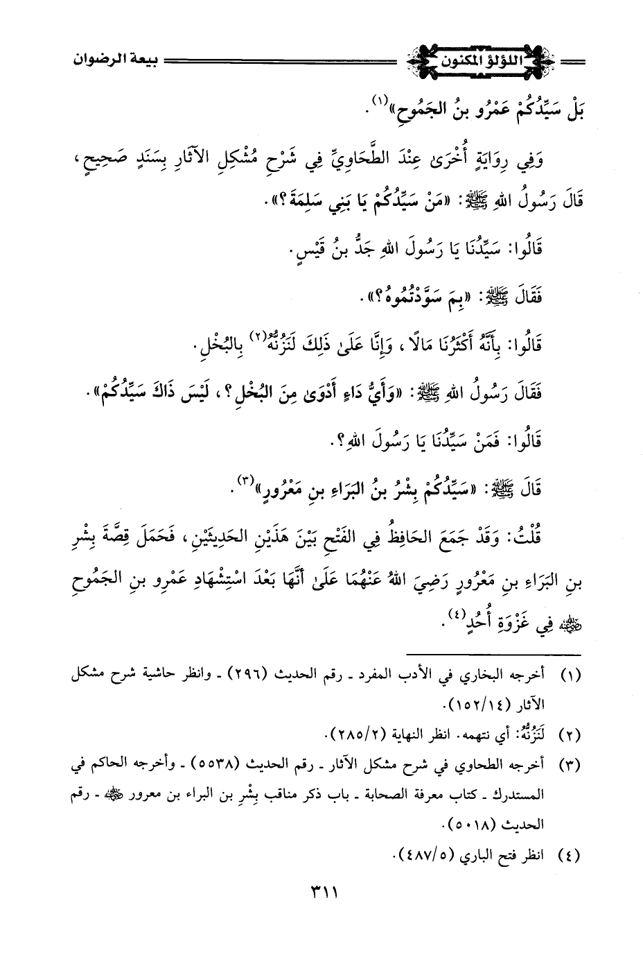 وَالجَدُّ بنُ قَيْسٍ هَذَا مِنَ الأَنْصَارِ مِنْ بَنِي سَلِمَةَ (¬4) قَدْ سَادَ في الجَاهِلِيَّةِ جَمِيعَ بَنِي سَلِمَةَ، فَانتزَعَ رَسُولُ اللَّهِ -صلى اللَّه عليه وسلم- مِنْهُ السِّيَادَةَ، وَجَعَلَ مَكَانَهُ عَمْرَو بنَ الجَمُوحِ، فَقَدْ أَخْرَجَ الإِمَامُ البُخَارِيُّ في الأَدَبِ المُفْرَدِ بِسَنَدٍ صَحِيحٍ عَلَى شَرْطِ مُسْلِمٍ عَنْ جَابِرٍ -رضي اللَّه عنه- أَنَّهُ قَالَ: قَالَ رَسُولُ اللَّهِ -صلى اللَّه عليه وسلم-: "مَنْ سَيِّدُكُمْ يَا بَنِي سَلِمَةَ؟ ".
