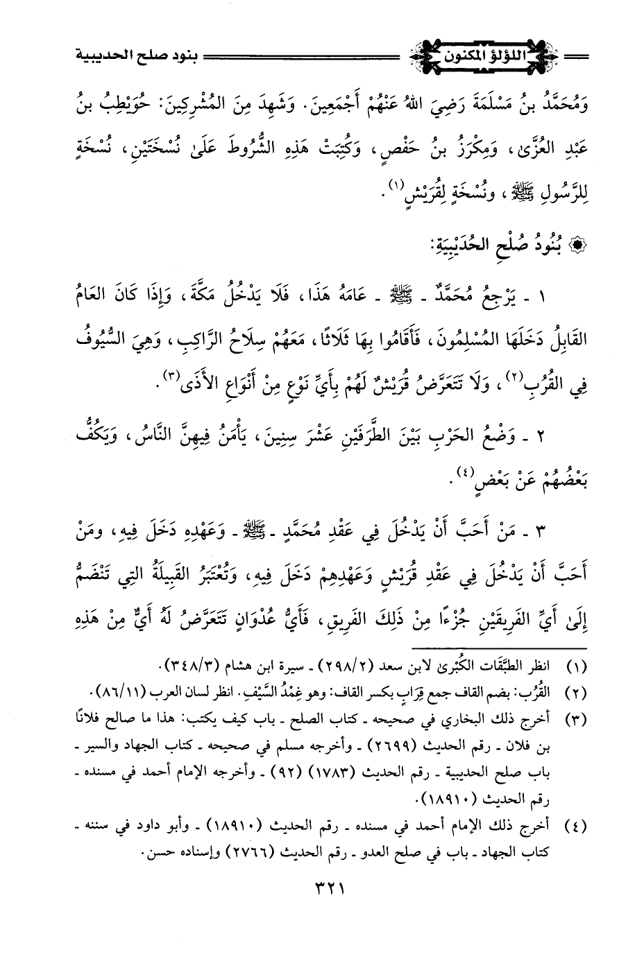 (¬3) أخرج الحديث: البخاري في صحيحه - كتاب الصلح - باب كيف يكتب: هذا ما صالح فلان ابن فلان - رقم الحديث (2698) (2699) - وأخرجه في كتاب الشروط - باب الشروط في الجهاد - رقم الحديث (2731) (2732) - وأخرجه مسلم في صحيحه - كتاب الجهاد والسير - باب صلح الحديبية - رقم الحديث (1783) (1784) - وأخرجه الإمام أحمد في مسنده - رقم الحديث (18910) (18928).
