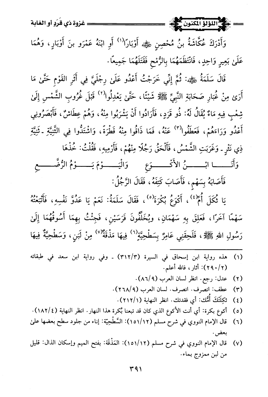 -رضي اللَّه عنه-، وَعَلَى أَثَرِهِ أَبُو قتَادَةَ فَارِسُ الرَّسُولِ -صلى اللَّه عليه وسلم-، وَعَلَى أَثَرِ أَبِي قتَادَةَ -رضي اللَّه عنه- المِقْدَادُ بنُ عَمْرٍو -رضي اللَّه عنه-، قَالَ: فَوَلَّى المُشْرِكُونَ مُدْبِرِينَ، وَنَزَلْتُ مِنَ الجَبَلِ، فَأَخَذْتُ بِعَنَانِ (¬1) فَرَسِ الأَخْرَمِ، وَقُلْتُ لَهُ: يَا أَخْرَمُ! احْذَرِ القَوْمَ لَا يَقْتَطِعُوكَ حَتَّى يَلْحَقَ رَسُولُ اللَّهِ -صلى اللَّه عليه وسلم- وَأَصْحَاُبهُ، فَقَالَ: يَا سَلَمَةُ إِنْ كُنْتَ تُؤْمِنُ بِاللَّهِ وَاليَوْمِ الآخِرِ، وَتَعْلَمُ أَنَّ الجَنَّةَ حَقٌّ وَالنَّارَ حَقٌّ، فَلَا تَحُلْ بَيْنِي وَبَيْنَ الشَّهَادَةِ، قَالَ: فَخَلَّيْتُ عَنَانَ فَرَسِهِ، وَلَحِقَ بِعَبْدِ الرَّحْمَنِ بنِ عُيَيْنَةَ، فَأَدْرَكَهُ فَاخْتَلَفَا طَعْنَتَيْنِ، فَعَقَرَ الأَخْرَمُ فَرَسَ عَبْدِ الرَّحْمَنِ، وَطَعَنَهُ عَبْدُ الرَّحْمَنِ فَقَتَلَهُ (¬2)، فتَحَوَّلَ عَبْدُ الرَّحْمَنِ عَلَى فَرَسِ الأَخْرَمِ.