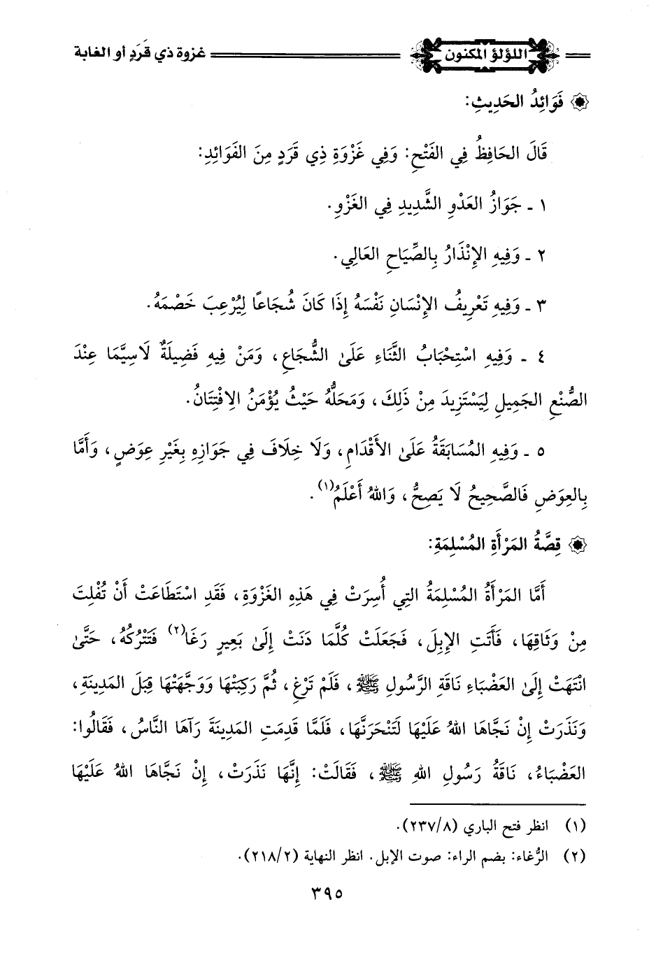 (¬1) سيأتي بعد قليل أن العضباء قد أصِيبَتْ مع المرأة المسلمة التي أُسِرَتْ، فاللَّه أعلم.