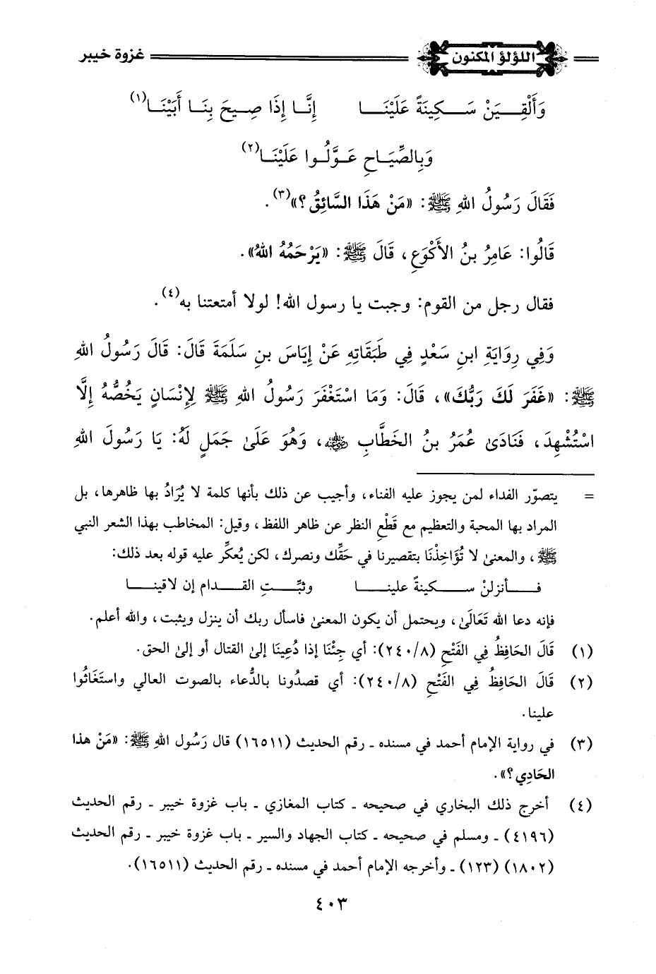 (¬5) قَالَ الحَافِظُ فِي الفَتْحِ (8/ 241): وهذه كانت عادتهم إذا أرادُوا تنشيط الإبل في السَّير ينزل بعضهم فيَسُوقُهَا ويَحْدُو في تلك الحال.
