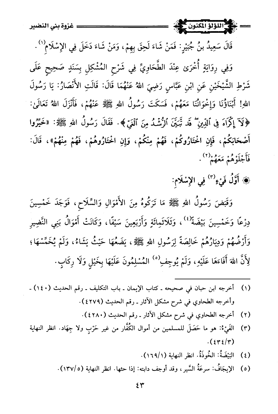 (¬2) أخرجه البخاري في صحيحه - كتاب المغازي - باب حديث بني النضير - رقم الحديث (4028) - ومسلم في صحيحه - كتاب الجهاد والسير - باب إجلاء اليهود من الحجاز - رقم الحديث (1766).