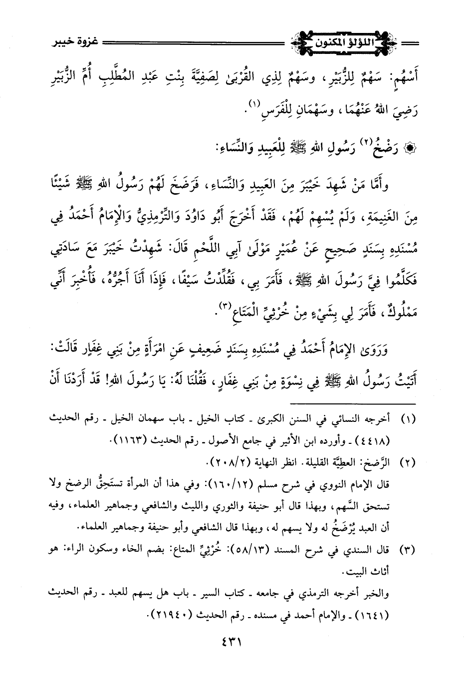 (¬3) أخرجه البخاري في صحيحه - كتاب المغازي - باب غزوة خيبر - رقم الحديث (4228) - وأخرجه الإمام أحمد في مسنده - رقم الحديث (4448).