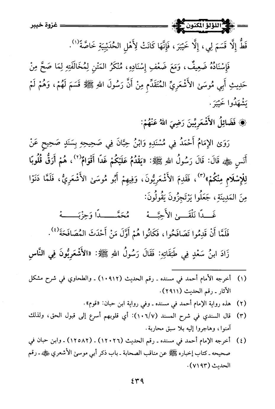 قُلْتُ: وَأَمَّا حَدِيثُ أَبِي هُرَيْرَةَ -رضي اللَّه عنه- الذِي رَوَاهُ الإِمَامُ أَحْمَدُ فِي مُسْنَدِهِ وَالطَّحَاوِيُّ فِي شَرْحِ مُشْكِلِ الآثارِ، وَلفظُهُ: مَا شَهِدْتُ مَعَ رَسُولِ اللَّهِ -صلى اللَّه عليه وسلم- مَغْنَمًا