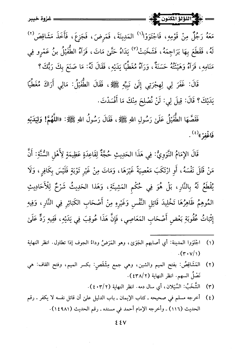 (¬4) أخرجه مسلم في صحيحه - كتاب الإيمان - باب الدليل على أن قاتل نفسه لا يكفر - رقم الحديث (116) - وأخرجه الإِمام أحمد في مسنده - رقم الحديث (14981).