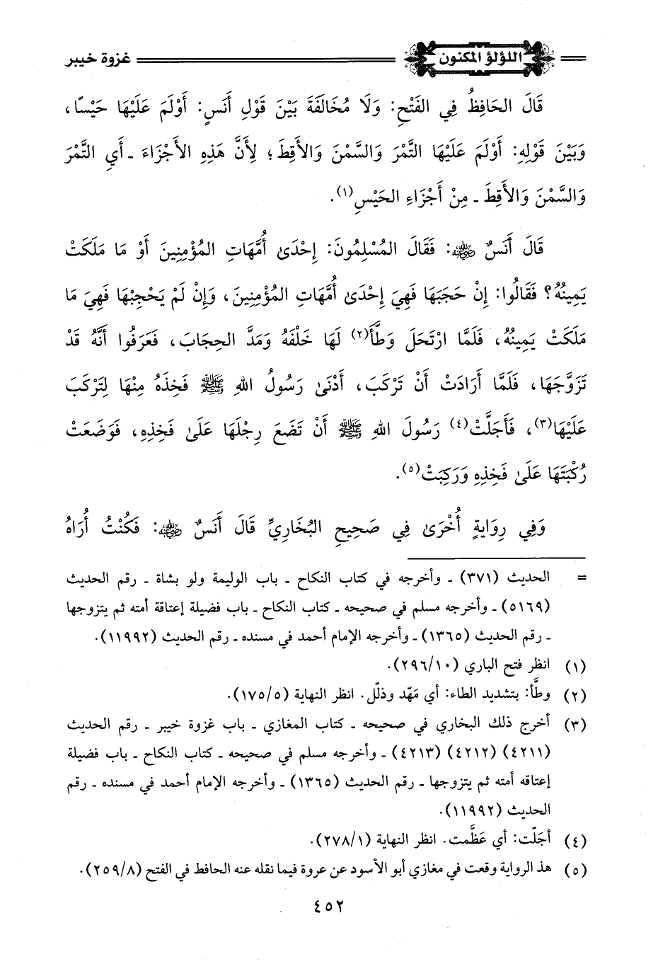 (¬3) أخرج ذلك البخاري في صحيحه - كتاب المغازي - باب غزوة خيبر - رقم الحديث (4211) (4212) (4213) - وأخرجه مسلم في صحيحه - كتاب النكاح - باب فضيلة إعتاقه أمته ثم يتزوجها - رقم الحديث (1365) - وأخرجه الإِمام أحمد في مسنده - رقم الحديث (11992).