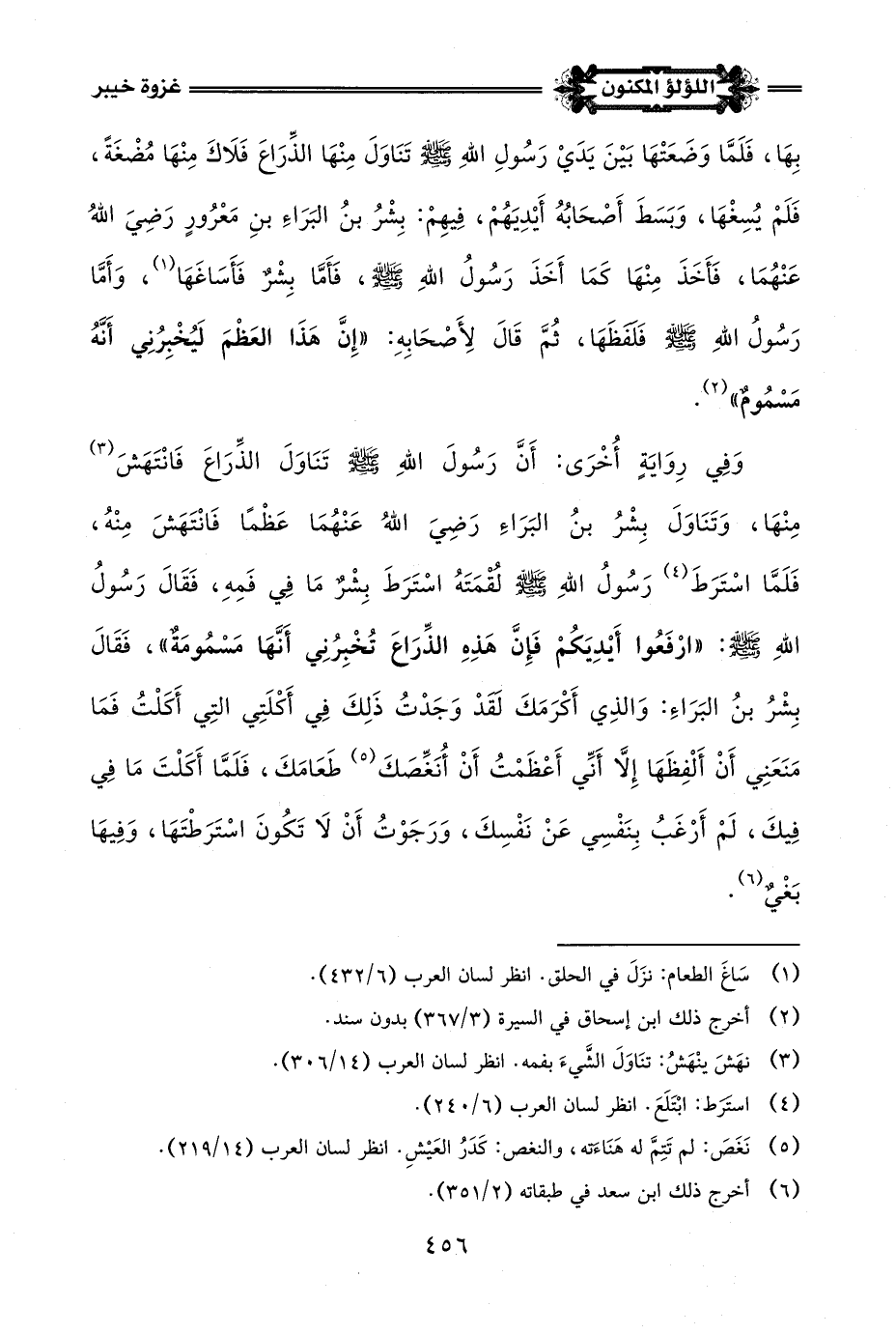 وَفِي رِوَايَةٍ أُخْرَى: أَنَّ رَسُولَ اللَّهِ -صلى اللَّه عليه وسلم- تَنَاوَلَ الذِّرَاعَ فَانْتَهَشَ (¬3) مِنْهَا، وَتَنَاوَلَ بِشْرُ بنُ البَرَاءَ رَضِيَ اللَّه عَنْهُمَا عَظْمًا فَانْتَهَشَ مِنْهُ، فَلَمَّا اسْتَرَطَ (¬4) رَسُولُ اللَّهِ -صلى اللَّه عليه وسلم- لُقْمَتَهُ اسْتَرَطَ بِشْرٌ مَا في فَمِهِ، فَقَالَ رَسُولُ اللَّهِ -صلى اللَّه عليه وسلم-: "ارْفَعُوا أَيْدِيَكُمْ فَإِنَّ هَذِهِ الذِّرَاعَ تُخْبِرُنِي أَنَّهَا مَسْمُومَةٌ"، فَقَالَ بِشْرُ بنُ البَرَاءِ: وَالذِي أَكْرَمَكَ لَقَدْ وَجَدْتُ ذَلِكَ في أَكْلَتِي التِي أَكَلْتُ فَمَا مَنَعَنِي أَنْ أَلْفِظَهَا إِلَّا أَنِّي أَعْظَمْتُ أَنْ أُنَغِّصَكَ (¬5) طَعَامَكَ، فَلَمَّا أَكَلْتَ مَا فِي فِيكَ، لَمْ أَرْغَبُ بِنَفْسِي عَنْ نَفْسِكَ، وَرَجَوْتُ أَنْ لَا تَكُونَ اسْتَرَطْتَهَا، وَفِيهَا بَغْيٌ (¬6)