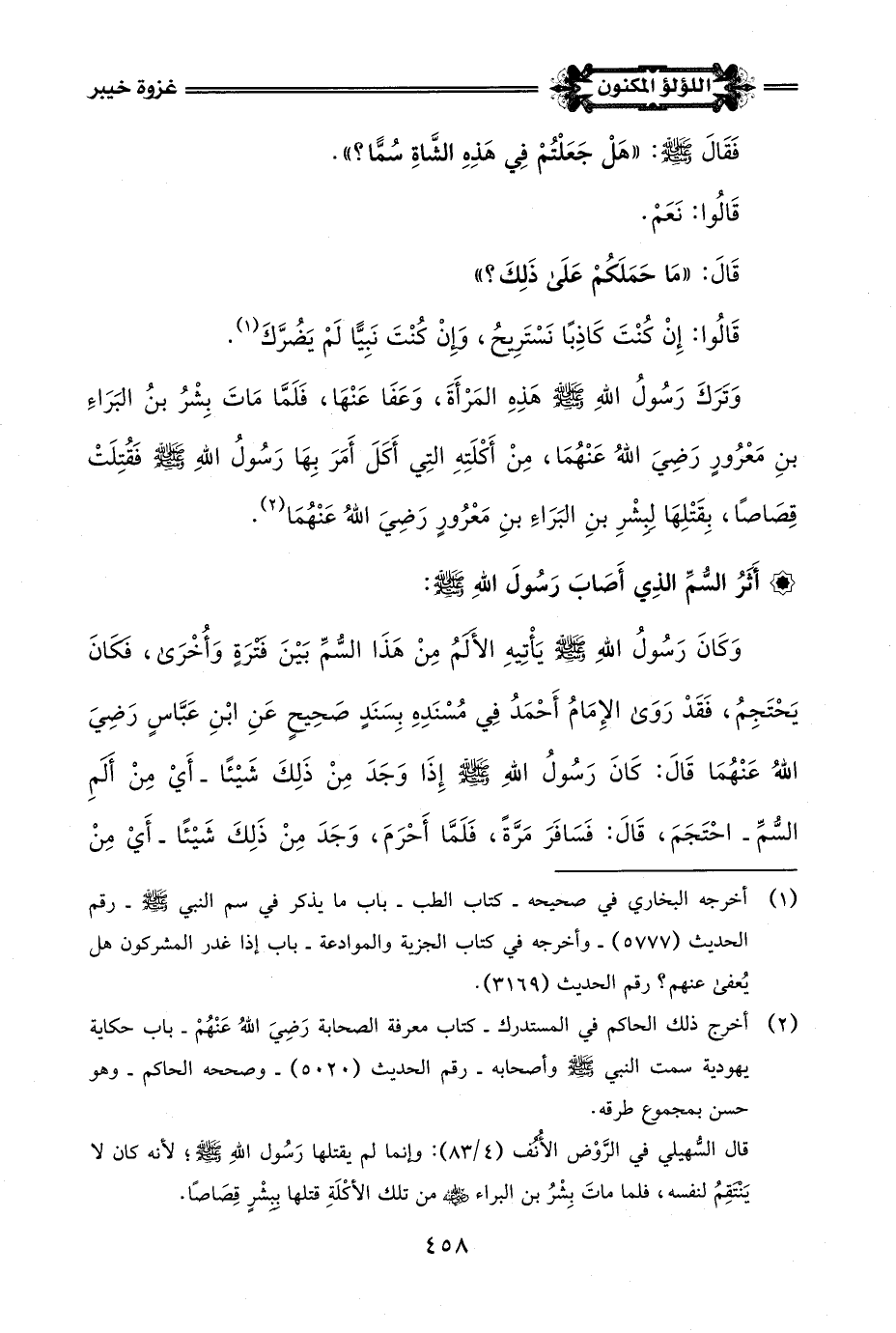 (¬2) أخرج ذلك الحاكم في المستدرك - كتاب معرفة الصحابة رَضِيَ اللَّهُ عَنْهُمْ - باب حكاية يهودية سمت النبي -صلى اللَّه عليه وسلم- وأصحابه - رقم الحديث (5020) - وصححه الحاكم -وهو حسن بمجموع طرقه.