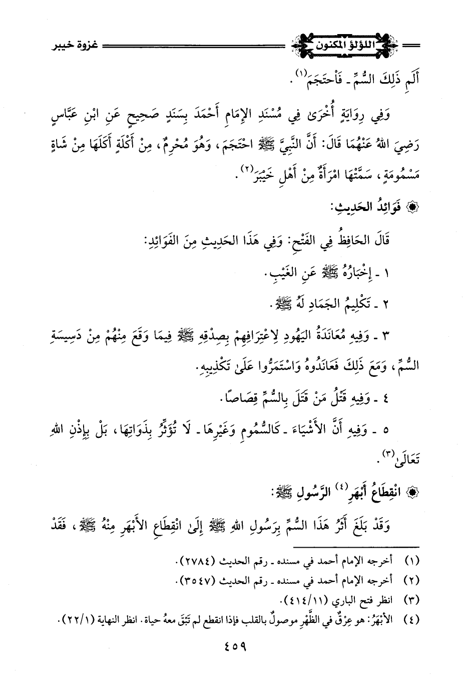 وَقَدْ بَلَغَ أَثَرُ هَذَا السّمِّ بِرَسُولِ اللَّهِ -صلى اللَّه عليه وسلم- إلى انْقِطَاعِ الأَبْهَرِ مِنْهُ -صلى اللَّه عليه وسلم-، فَقَدْ