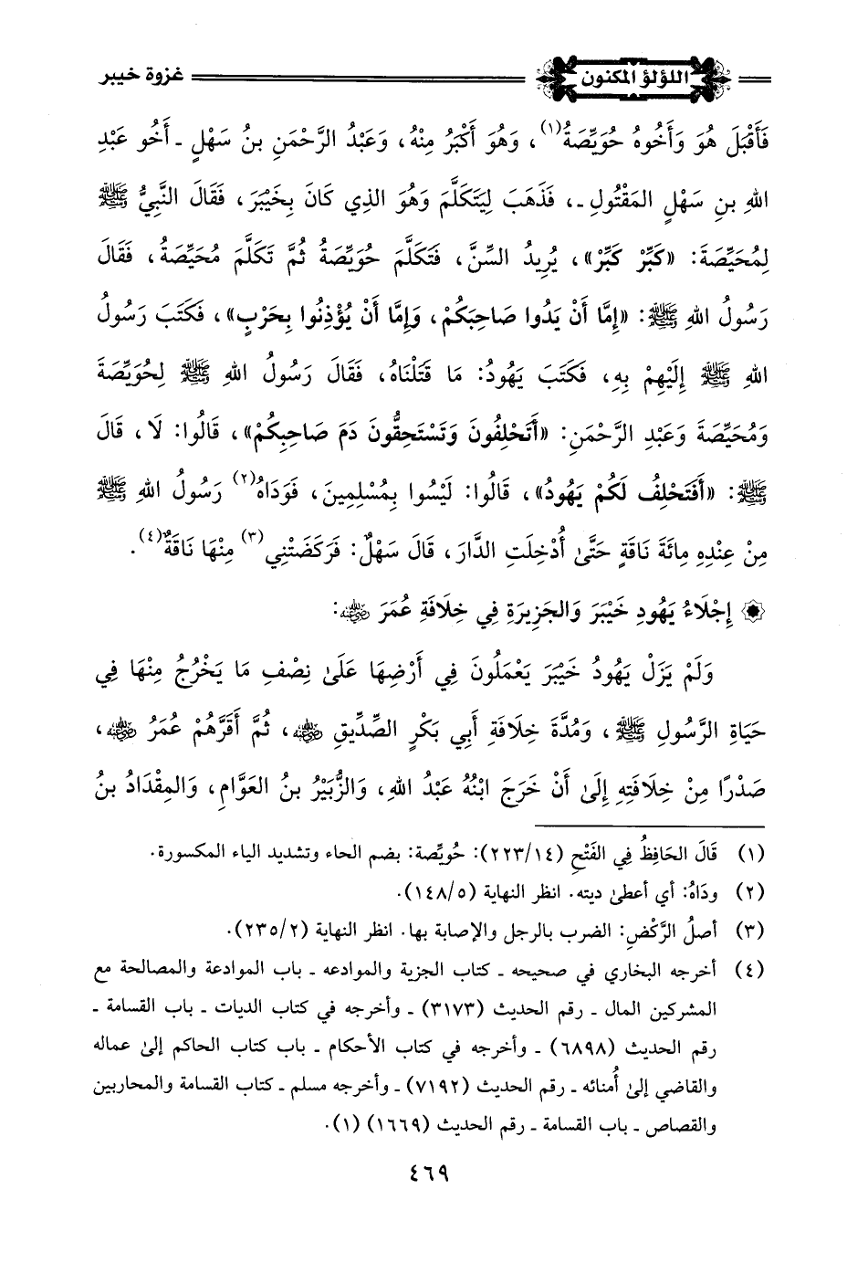(¬4) أخرجه البخاري في صحيحه - كتاب الجزية والموادعة - باب الموادعة والمصالحة مع المشركين المال - رقم الحديث (3173) - وأخرجه في كتاب الديات - باب القسامة - رقم الحديث (6898) - وأخرجه في كتاب الأحكام - باب كتاب الحاكم إلى مسألة والقاضي إلى أُمنائه - رقم الحديث (7192) - وأخرجه مسلم - كتاب القسامة والمحاربين والقصاص - باب القسامة - رقم الحديث (1669) (1).